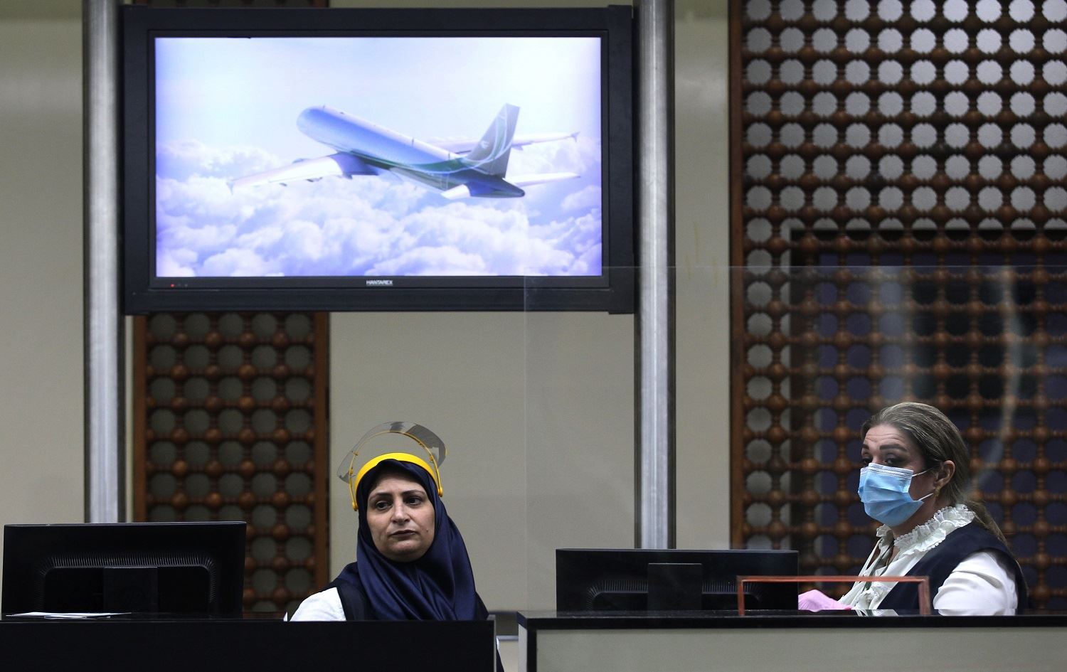 ستافی هێڵێکی ئاسمانی لە هۆڵی رۆیشتنی فڕۆکەخانەی نێودەوڵەتیی بەغداد لە 23ی تەممووزی 2020. وێنە: Ahmad al-Rubaye/AFP