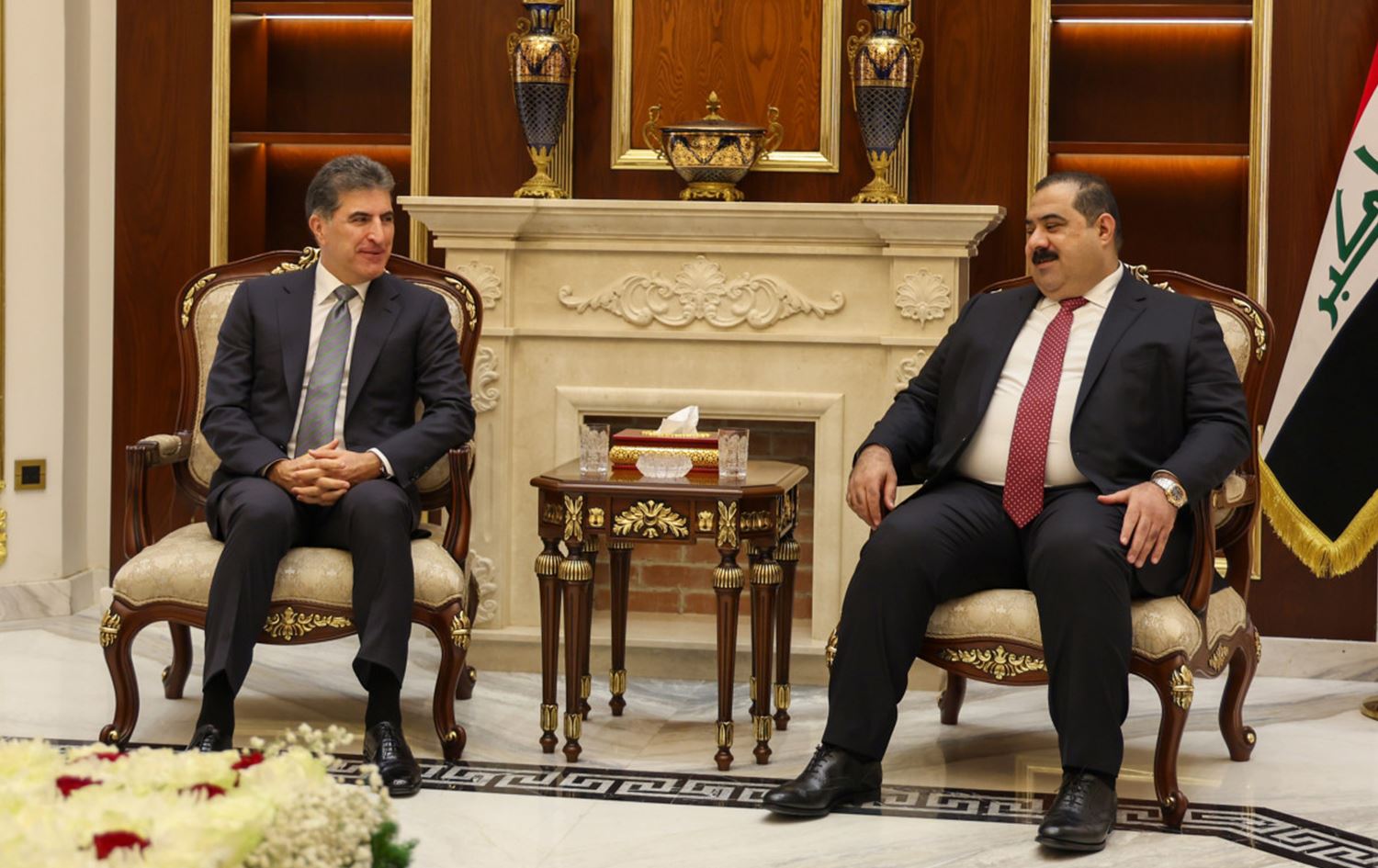 نێچیرڤان بارزانی، سەرۆکی هەرێمی کوردستان و موسەننا سامەڕائی، سەرۆکی هاوپەیمانيی عەزم لە بەغدا کۆبوونەوە. جەختیان لە پێویستی پاراستنی مافەکانی هەموو پێکهاتەکانی عێراق کردەوە.