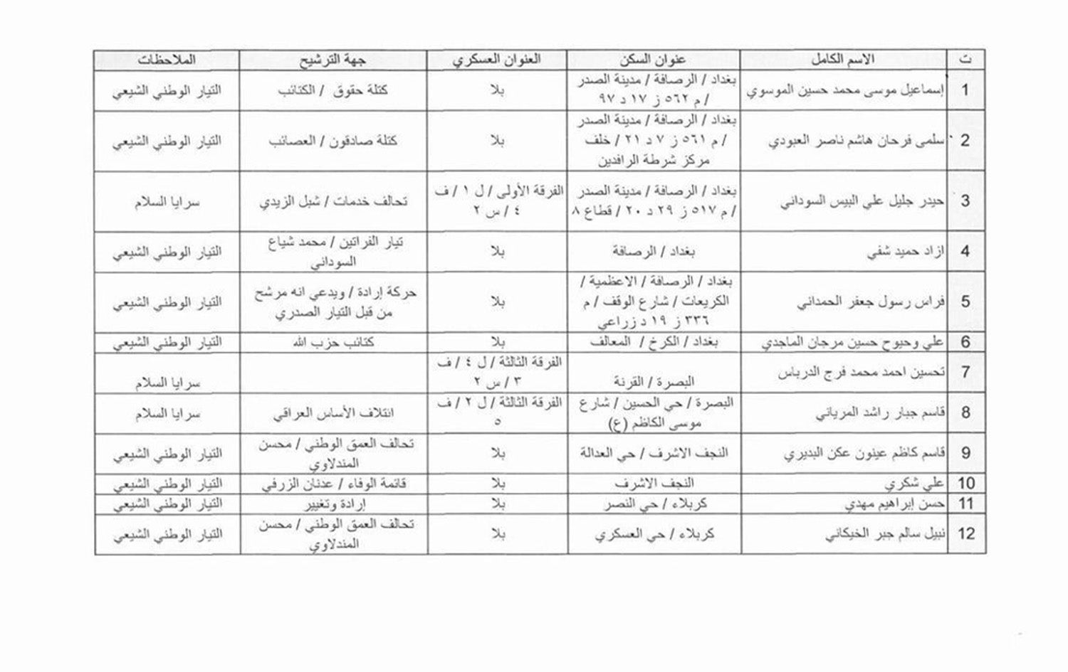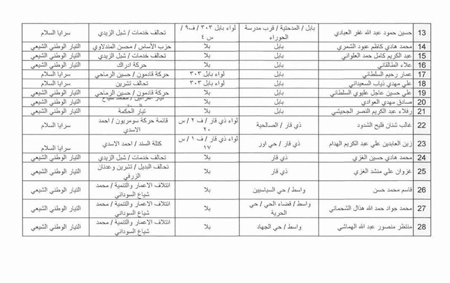 لەو 31 بەربژێرە، هەشتیان ئەندامی گرووپی سەرایا سەلامن کە گرووپێکی نێو دەستەی حەشدی شەعبیە و سەر بە رەوتی نیشتمانیی شیعەن. زۆرینەیان بەربژێری هەردوو هاوپەیمانیی (ئاوەدانکردنەوە و گەشەپێدان)ی محەممەد شیاع سوودانی، سەرۆکوەزیران و هاوپەیمانیی (ئەساس) بە سەرۆکایەتیی موحسین مەندەلاوی، جێگری یەکەمی سەرۆکی پەرلەمانن.