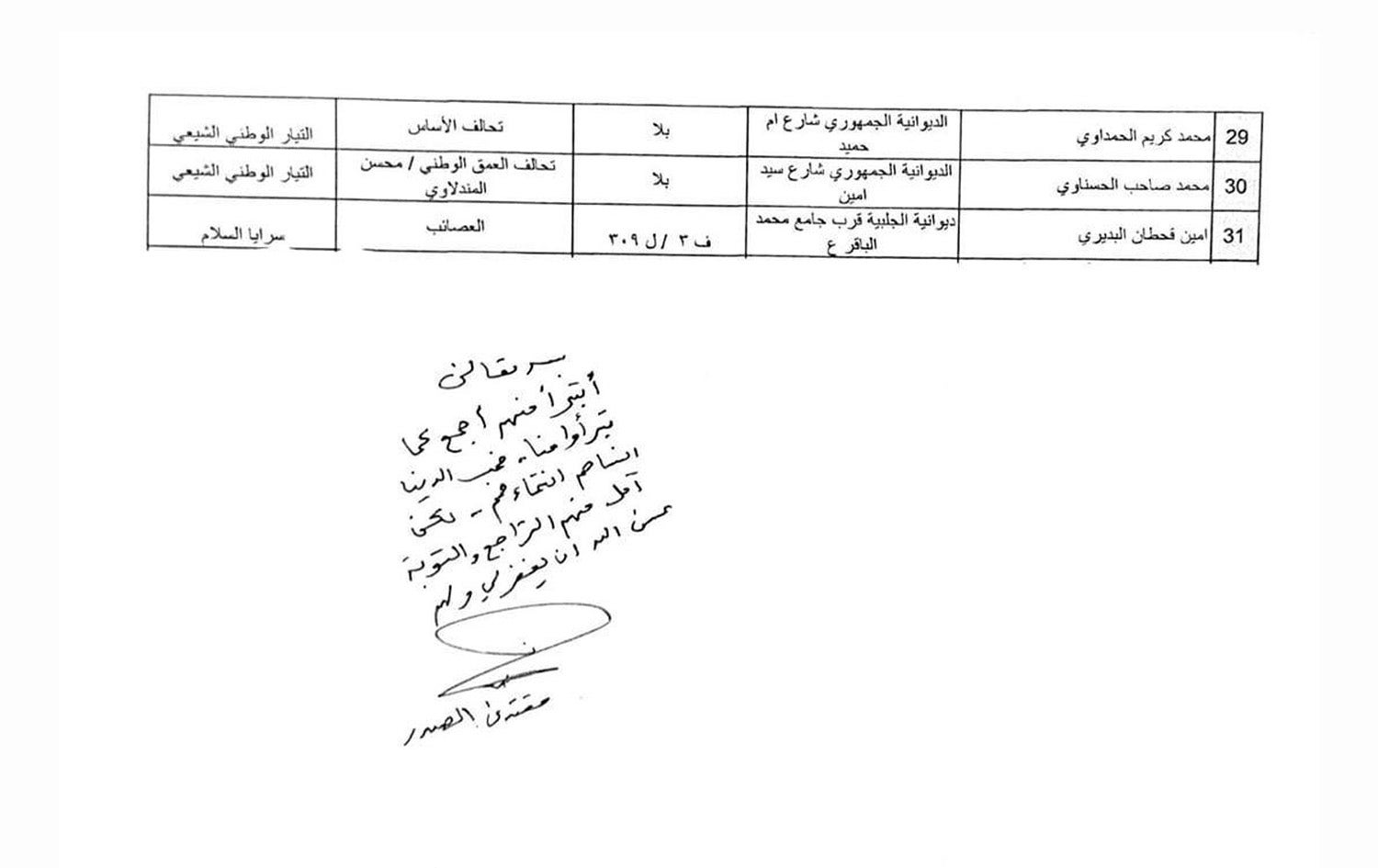 موقتەدا سەدر، سەرۆکی رەوتی نیشتمانیی شیعە، 31 ئەندام لە رەوتەکەی و گرووپی چەکداری سەرایا سەلام دەردەکات، بەهۆی ئەوەی لە لیستەکانی دیکە بۆ هەڵبژاردنی پەرلەمانی عێراق خۆیان بەربژێر کردووە. لە بڕیارەکەدا دەڵێت، "خۆشەویستیی دنیا لایەنگریی ئێمەی بیربردوونەتەوە و بەهیوام تۆبە بکەن و پەشیمان ببنەوە."