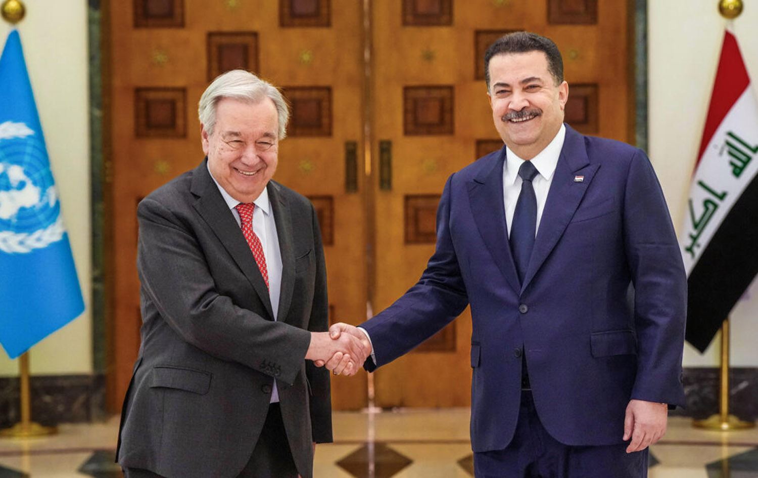 محەممەد شیاع سوودانی، سەرۆکوەزیرانی عێراق و ئەنتۆنیۆ گوتێرێز، سکرتێری گشتیی نەتەوە یەکگرتووەکان. وێنە: AFP