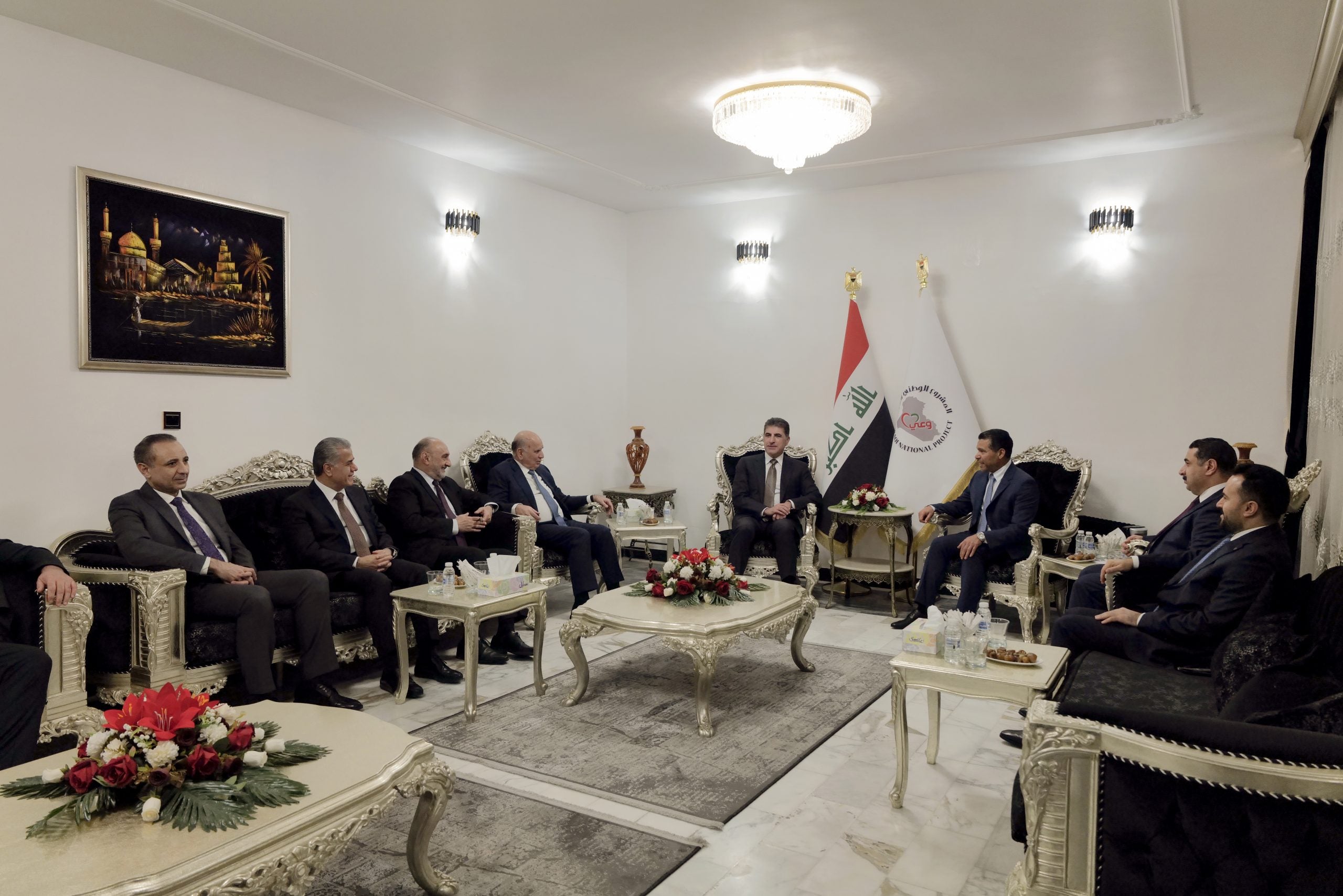 رۆژی شەممە، 13ی کانوونی دووەمی 2024 نێچیرڤان بارزانی، سەرۆکی هەرێمی کوردستان بە سەردانێک گەیشتە بەغدا و هەمان رۆژ لەگەڵ محەممەد شیاع سوودانی، سەرۆکوەزیرانی عێراق؛ فایەق زێدان، سەرۆکی ئەنجوومەنی باڵای دادوەری؛ محەممەد حەلبووسی، سەرۆکی پارتی تەقەدووم؛ نووری مالیکی، سەرۆکی هاوپەیمانیی دەوڵەتی یاسا؛ قەیس خەزعەلی، ئەمینداری گشتی عەسائیبی ئەهلی حەق و ئەلینا رۆمانۆوسکی، باڵیۆزی ئەمریکا لە عێراق کۆبووەوە.