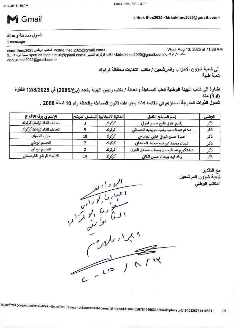 نووسراوەکە لەلایەن "نووسینگەی نیشتمانی"یەوە لە 13ـی ئابی 2025 ئاراستەی "لقی کاروباری پارت و بەربژێرەکان/ نووسینگەی هەڵبژاردنەکانی پارێزگای کەرکووک" کراوە. تێیدا ئاماژە بە نووسراوی ژمارە (م.خ/2085)ـی نووسینگەی سەرۆکی دەستەی لێپرسینەوە و دادپەروەری کراوە و داوا دەکات ئەو 6 بەربژێرە یاسای لێپرسینەوە و دادپەروەریی ژمارە 10ـی ساڵی 2008 دەیانگرێتەوە.