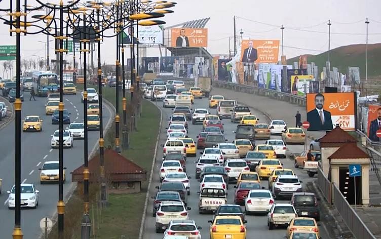 پۆستەری بەربژێران و لیستەکانیان بۆ بانگەشەی هەڵبژاردنی ئەنجوومەنی پارێزگاکانی عێراق لە شەقامێکی موسڵ،