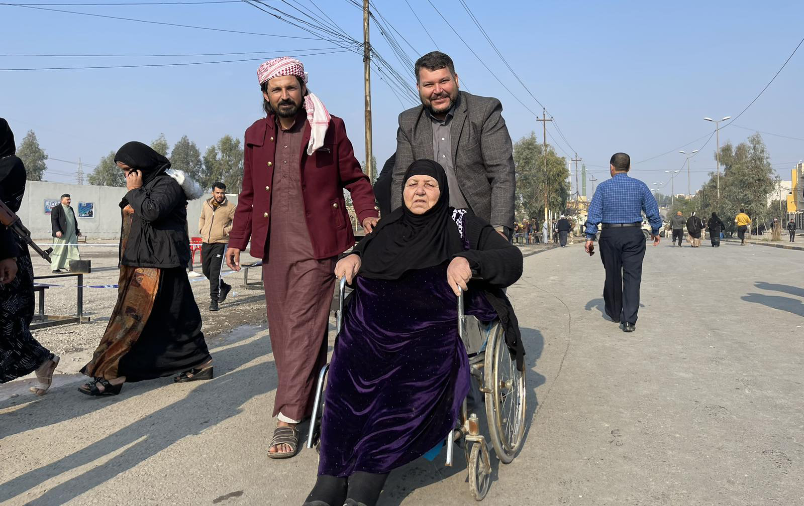 خێزانێک لە سەنتەری شاری موسڵ دەچنە دەنگدان، دایکەکە نەخۆشە و لەسەر عەرەبانە هێناویانە. وێنە: رووداو