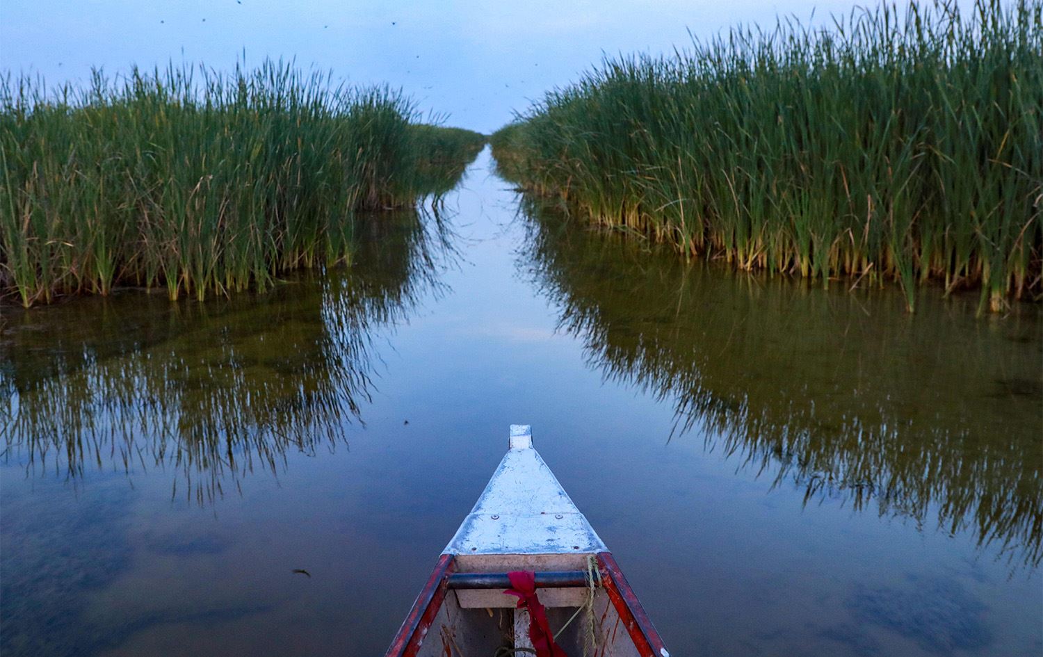 دووکەڵێکی خۆڵەمێشیی تۆخ ئاسمانەکەی تەنیوە و بڵێسەی سووتانی گازەکەی لە بەلەمەکانی راوە ماسییەوە دەبینرێن کە بەنێو زۆنگاوە کەمئاوەکاندا دەگەڕێن، ئەو زۆنگاوانەی بە دەست ساڵانێکی زۆر لە وشکەساڵیی سەخت و کەمبوونەوەی ئاوەوە دەناڵێنن.