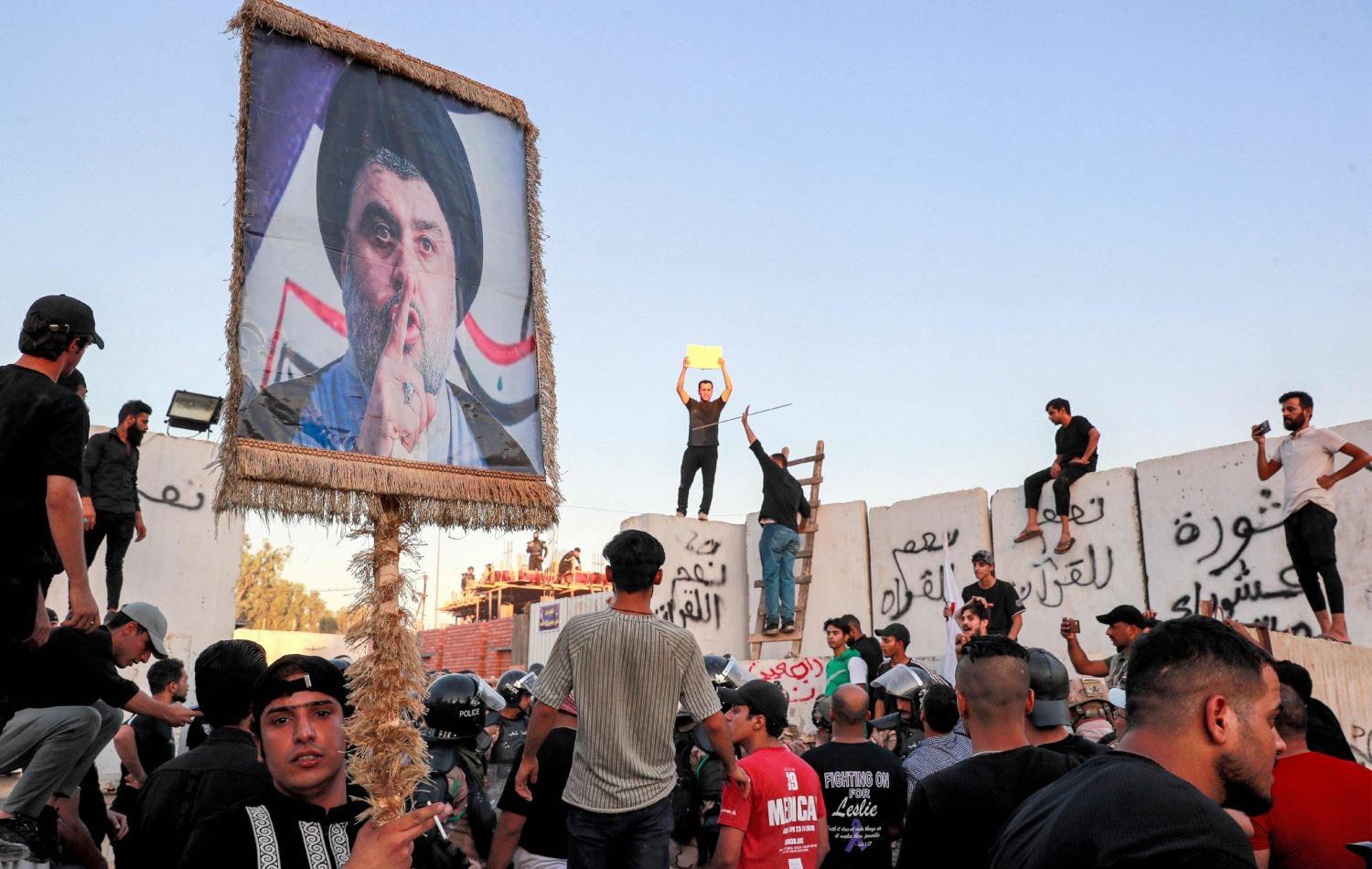 وێنەیەکی موقتەدا سەدر کە لەلایەن خۆپیشاندەرانەوە لەبەردەم باڵیۆزخانەی سوێد لە بەغدا بەرزکراوەتەوە، وێنە: AFP