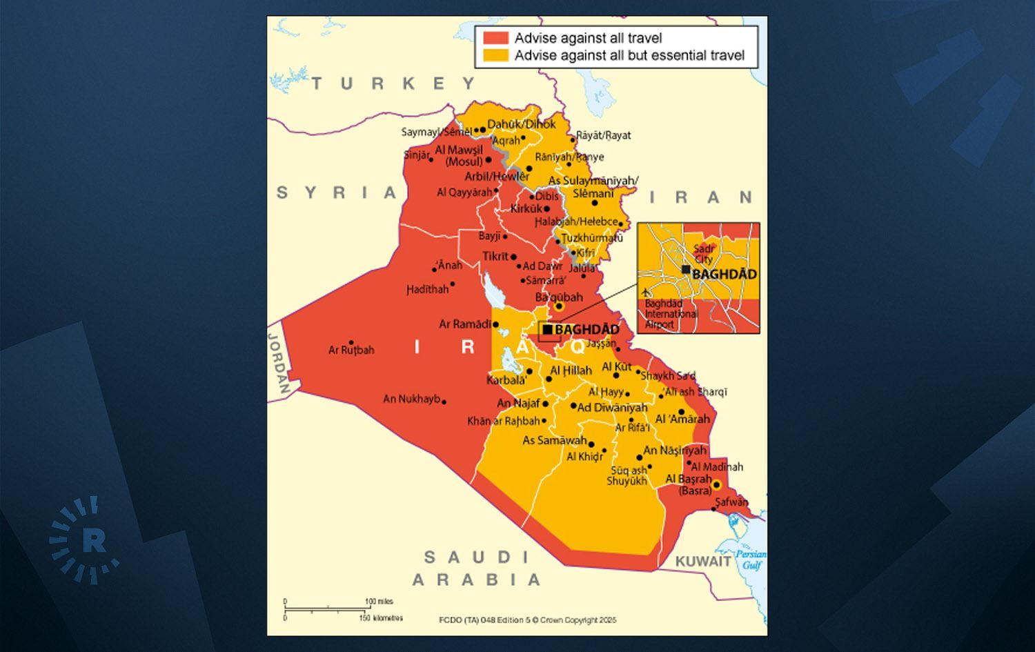 ئەو نەخشەی عێراق کە لە ماڵپەڕی وەزارەتی دەرەوەی بەریتانیا هەیە و سەلامەتیی ناوچەکانی عێراقی بە رەنگی جیاواز کردووە