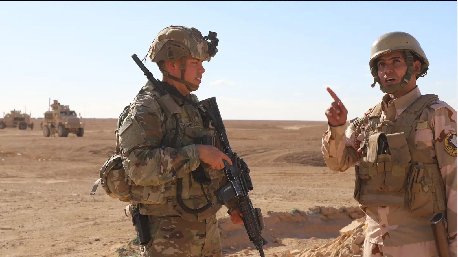 سەربازێکی ئەمریکی و سەربازێکی عێراقی لە بنکەی عەین ئەسەد پێکەوە قسە دەکەن. وێنەکە ساڵی 2021 گیراوە.