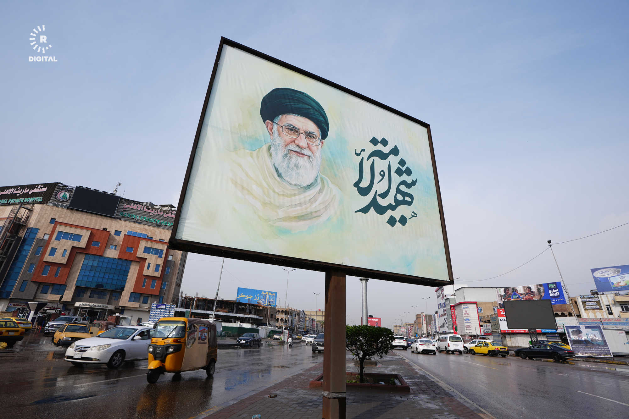 پۆستەری موجتەبا خامنەیی، رێبەری نوێی ئێران و ئایەتوڵڵا عەلی خامنەیی، رێبەری پێشووی ئەو وڵاتە کە لە هێرشی مانگی رابردووی ئەمریکا و ئیسرائیلدا کوژرا، لە سەرانسەری بەغدای پایتەختی عێراق هەڵواسراون.