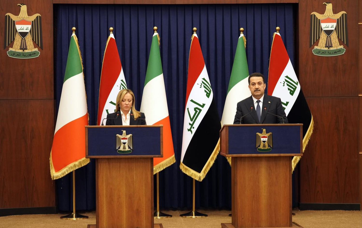 کۆنگرەی رۆژنامەڤانیی محەممەد شیاع سوودانی، سەرۆکوەزیرانی عێراق و جۆرجیا میلۆنی، سەرۆکوەزیرانی ئیتاڵیا کە لەم وێنەیەدا وا بڵاوکرایەوە کە ئاڵای ئێرلەندا بۆ سەرۆکوەزیرانی ئیتاڵیا دانراوە