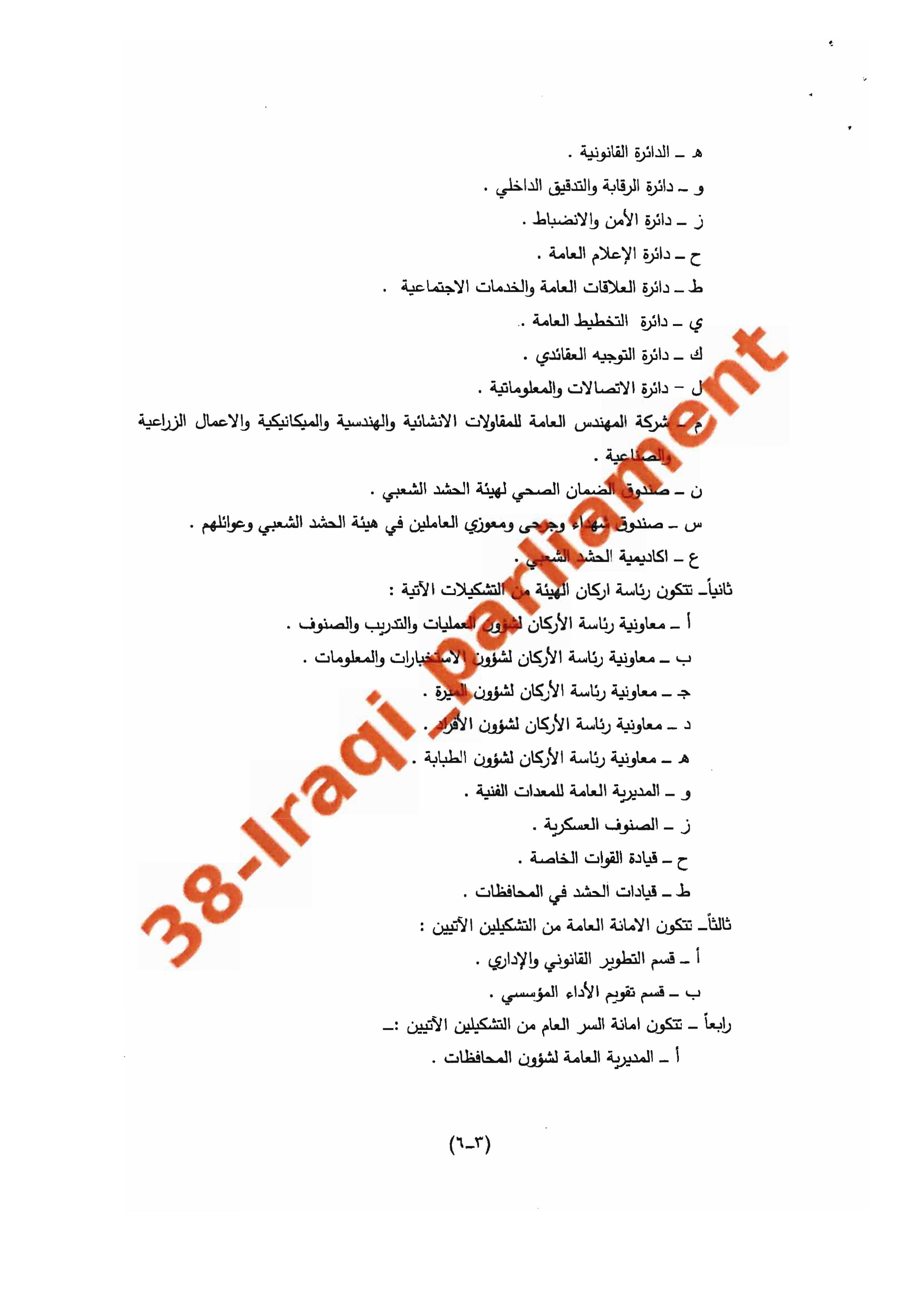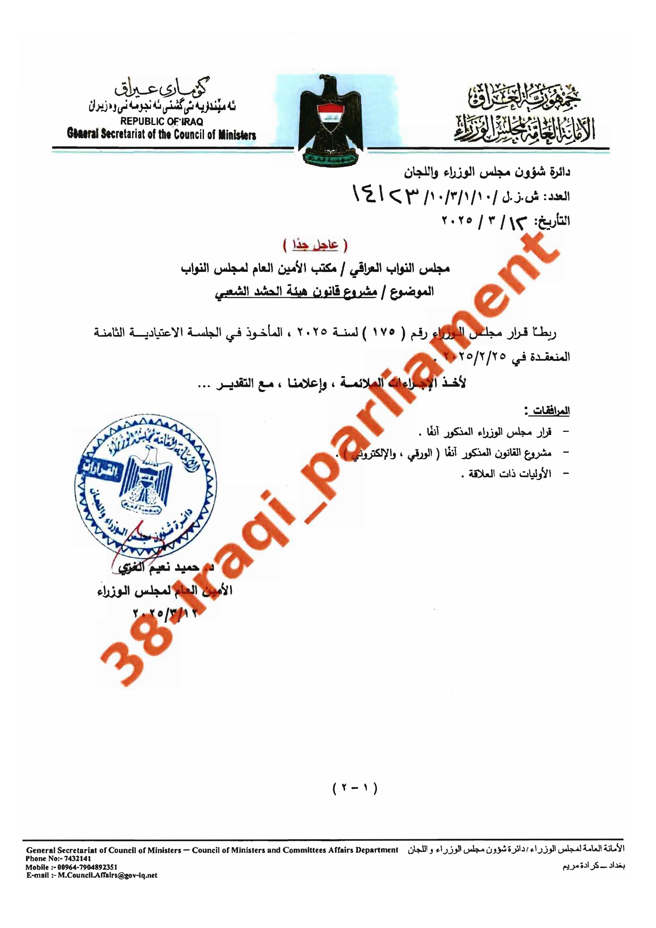 سەرۆکى دەستەى حەشدی شەعبی پلەى وەزیر دەبێت، هاوکات ئەندامى لیژنەى ئاسایشى نیشتمانی دەبێت، دەتوانێت هەندێک لە دەسەڵاتەکانى بداتە سەرۆک ئەرکان یان ئەمیندارى گشتى، هەروەها پێویستە دەسەڵاتى وەزیرى بەرگرى جێبەجێبکات لە جێبەجێکردنی یاسا سەربازییەکان لەسەر چەکدارەکانى دەستەکە.