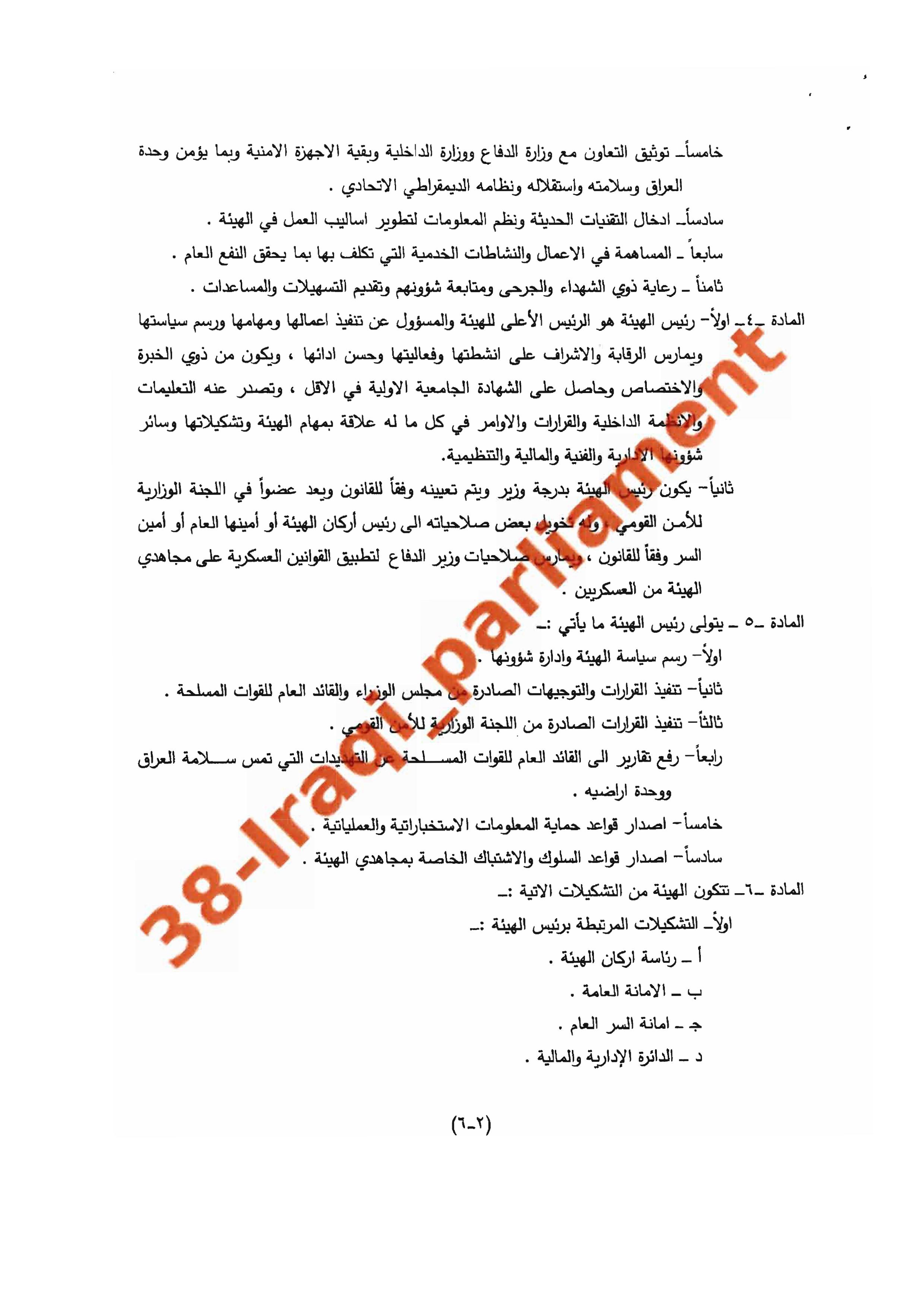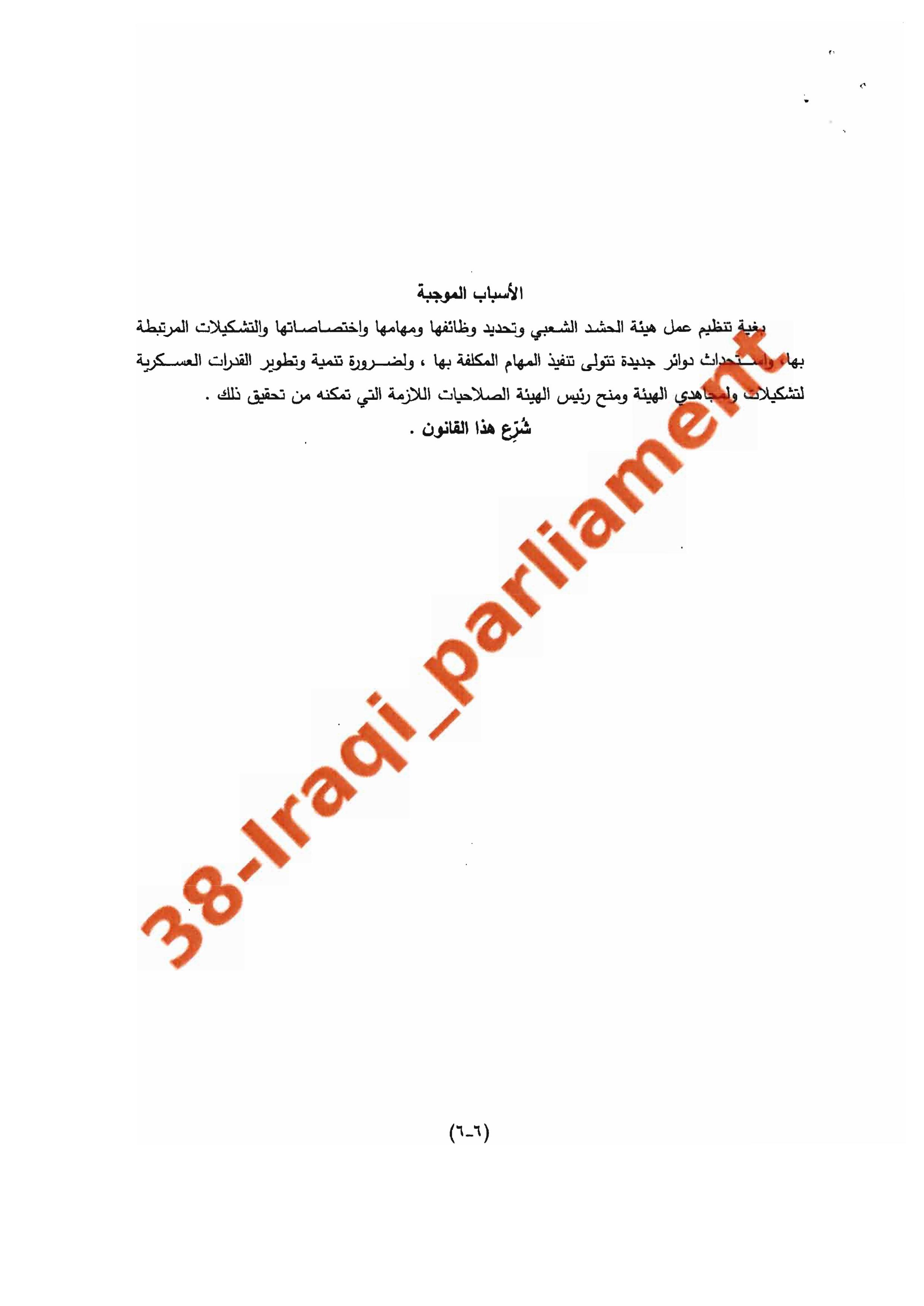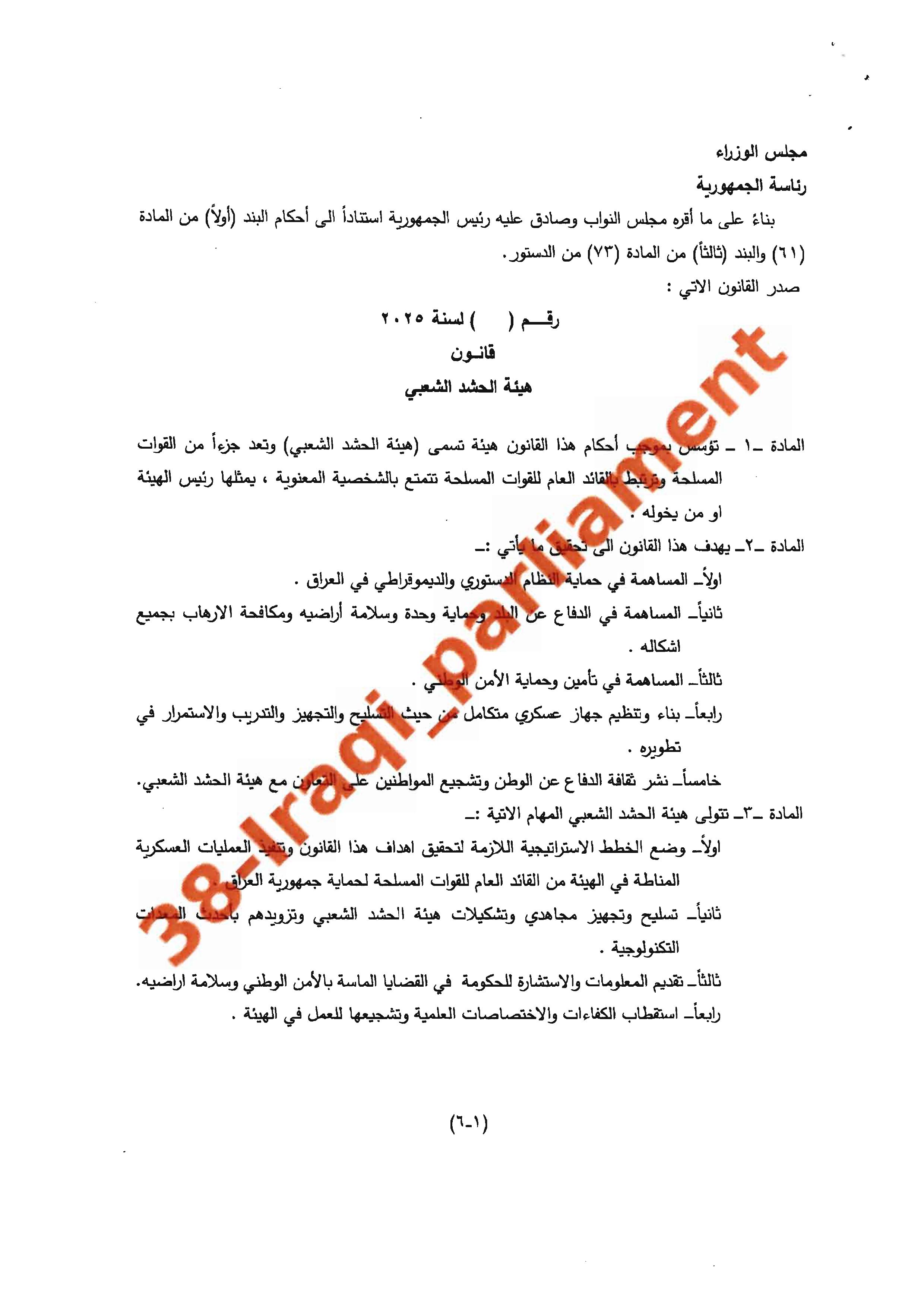 لەو پڕۆژەیاسایەدا حەشدی شەعبی وەک بەشێک لە هێزە چەکدارەکانى عێراق پێناسەکراوە و بەستراوەتەوە بە فەرماندەى گشتیی هێزە چەکدارەکانەوە.