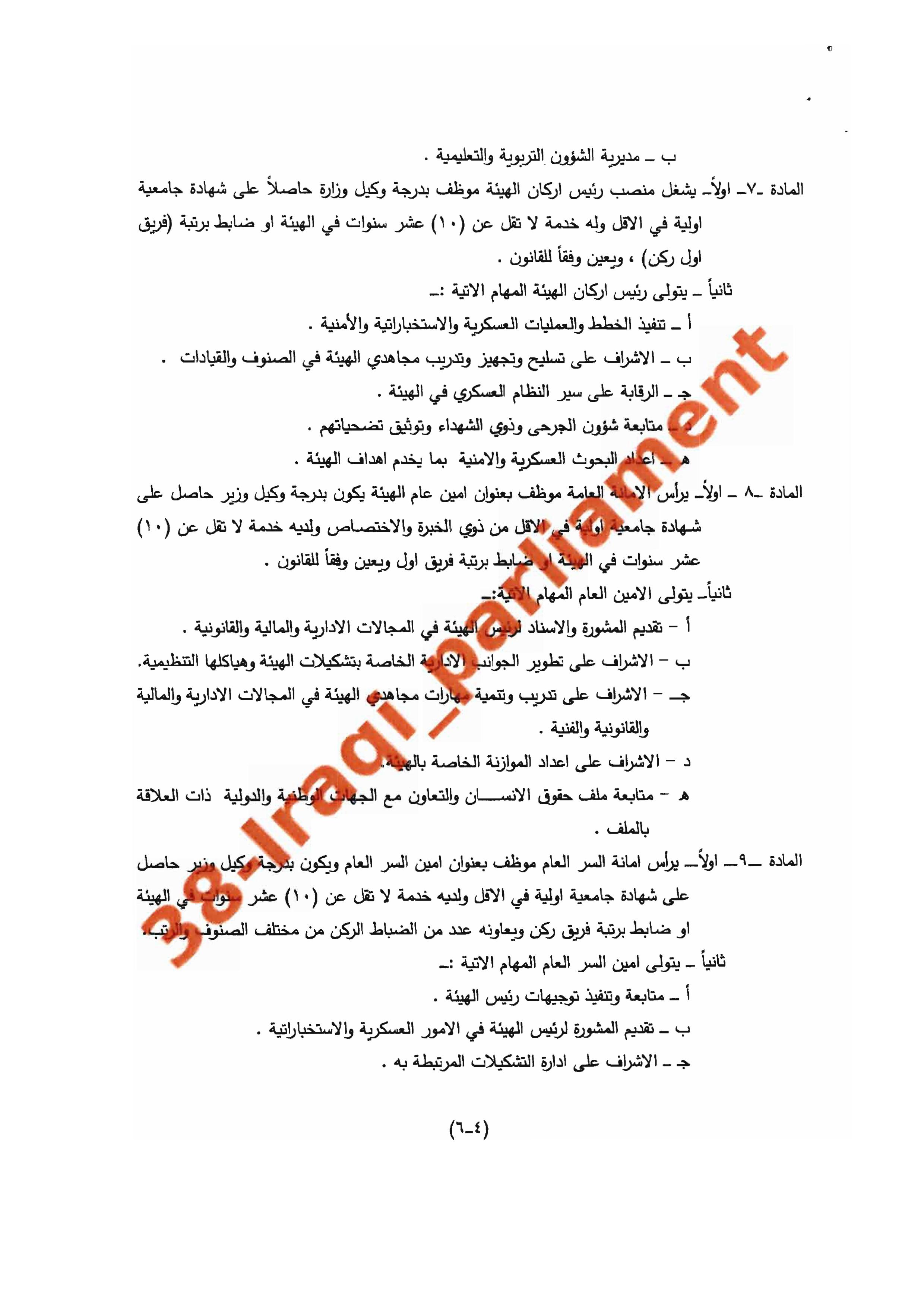 سەرۆک ئەرکانى دەستەى حەشدی شەعبى پێویستە بڕوانامەى زانکۆى هەبێت، خزمەتى لە 10 ساڵ زیاتر بێت لەو دەستەیە، ئەفسەر بێت بە پلەى فەریق روکن؛ ئەمیندارى گشتیش دەبێت 10 ساڵ خزمەتى لەو دەستەیە دا هەبێت و بەپلەى فەریقى یەکەم بێت.
