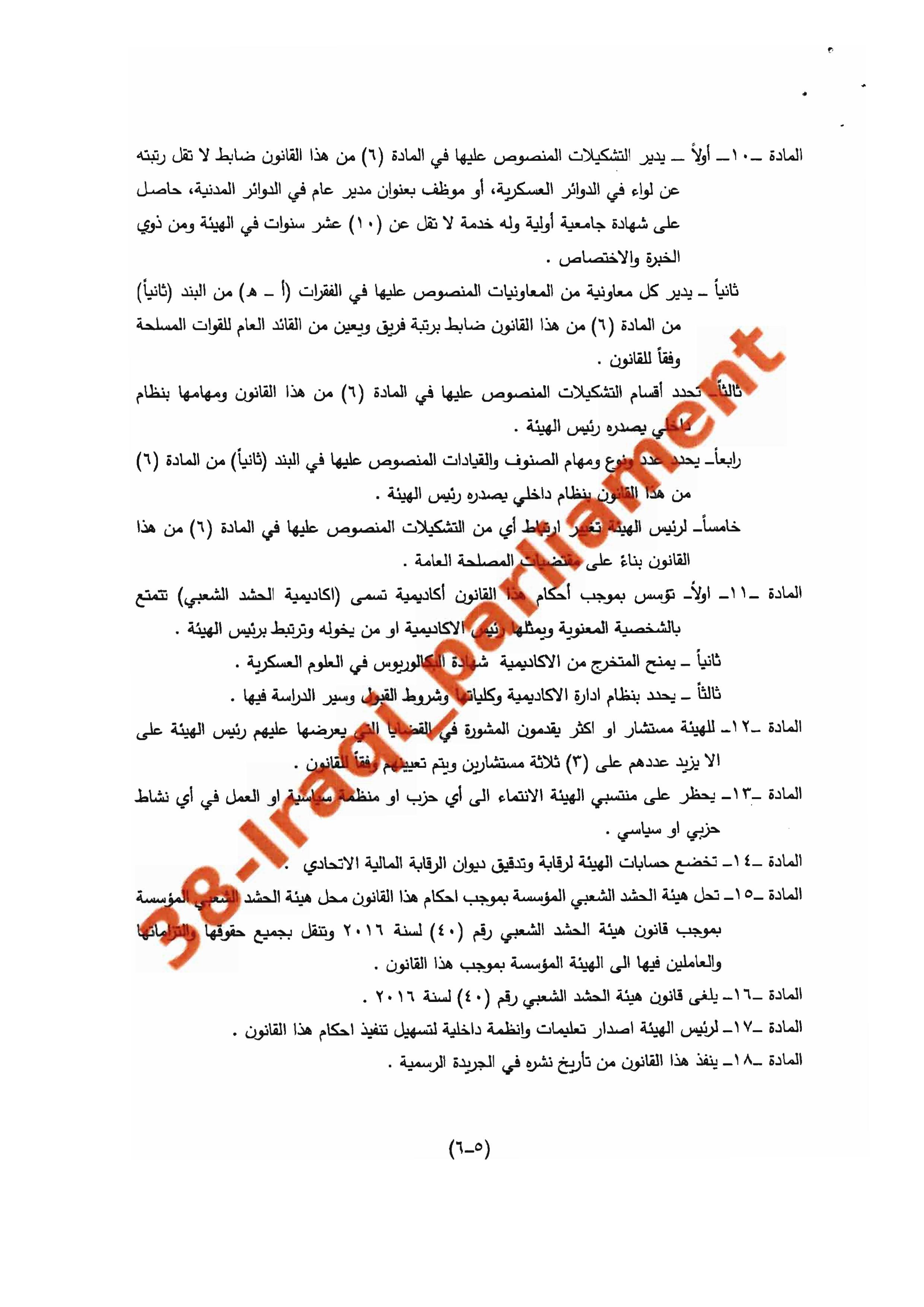 لە پڕۆژەیاساکەدا هاتووە؛ دەستەى حەشدی شەعبی دواى دەرچوواندنى یاساکە، دەچێتە ژێر رێکارەکانى ئەو یاسایەوە، لەبرى یاساى دەستەى حەشدی شەعبی ژمارە 40ـی ساڵى 2016.
