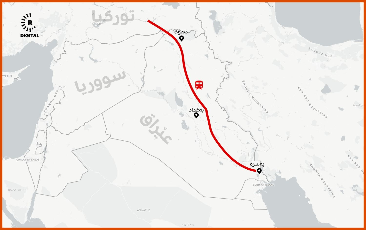 لەسەر نەخشە ئەوە روونکراوەتەوە کە هێڵی شەمەندەفەری عێراق لە بەسرەوە دەستپێدەکات، بە دهۆکدا تێپەڕ دەبێت و دەچێتە تورکیا