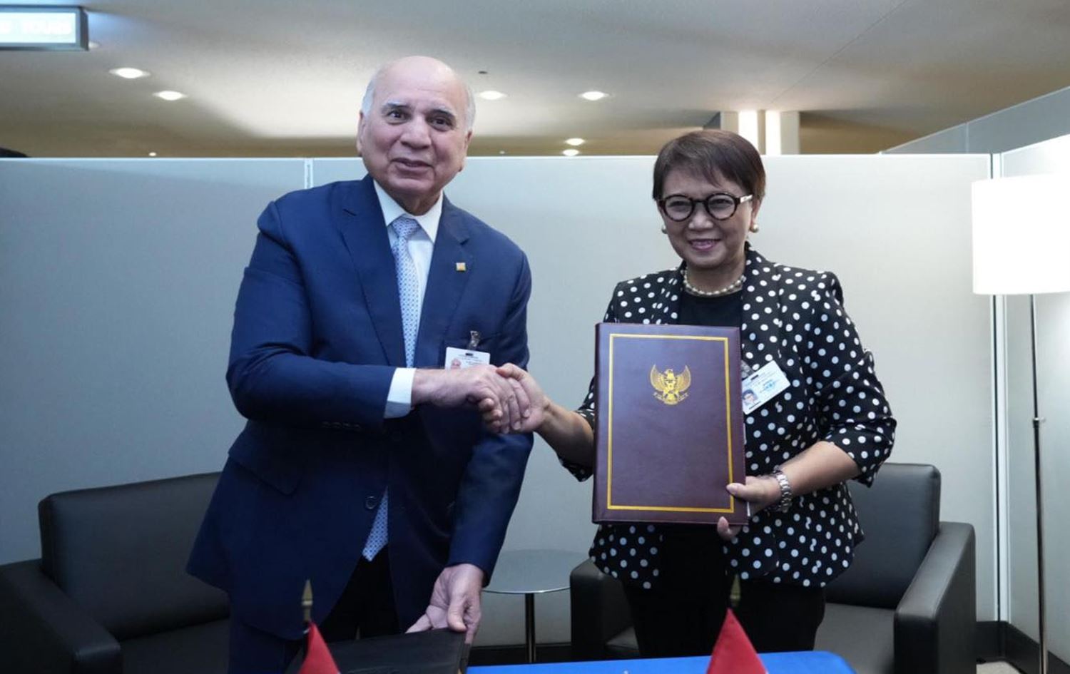 دووشەممە، 23-09-2024، وەزارەتی دەرەوەی عێراق راگەیێندراوێکی بڵاوکردەوە و تێیدا هاتووە: "فوئاد حوسێن، وەزیری دەرەوەی عێراق و رێتنۆ مارسوودی، وەزیری دەرەوەی ئیندۆنیزیا، رێککەوتنێکیان واژۆ کرد؛ بۆ لێخۆشبوون و هەڵگرتنی ڤیزە بۆ خاوهن پاسپۆرتی دیپلۆماسی و خزمەتگوزاریی لەكاتی سهردانی هاووڵاتیانی هەردوولا."