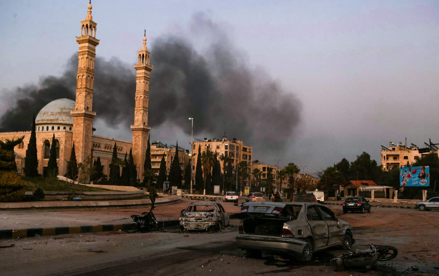 ئۆتۆمبێلی بۆردوومانکراو و بەرزبوونەوەی دووکەڵ لە حەلەبی سووریا بەهپی بۆردوومانی گرووپە چەکدارەکان لەلایەن سوپای سووریاوە لە 29-11-2024، وێنە: AAREF WATAD / AFP
