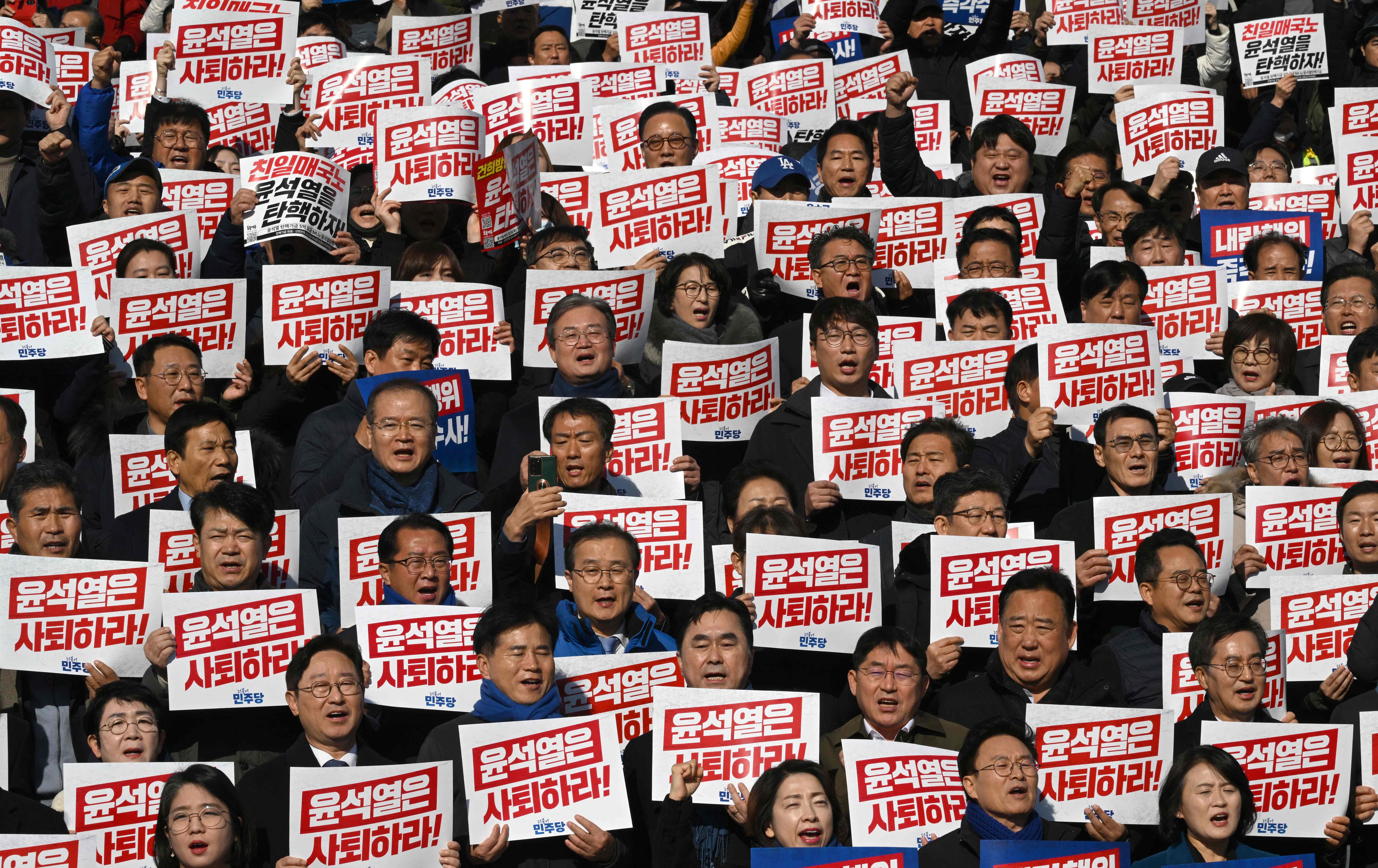 پەرلەمانتار و لایەنگرانی پارتە ئۆپۆزیسیۆنەکانی کۆریای باشوور، داوای دەستلەکارکێشانەوەی سەرۆکی وڵات دەکەن. وێنە: AFP