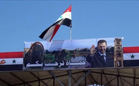 وێنەی بەشار ئەسەد، سەرۆکی سووریا و ڤلادمیر پووتین، سەرۆکی رووسیا بەگەورەیی لەسەر رێگاکە هەڵواسراوە.