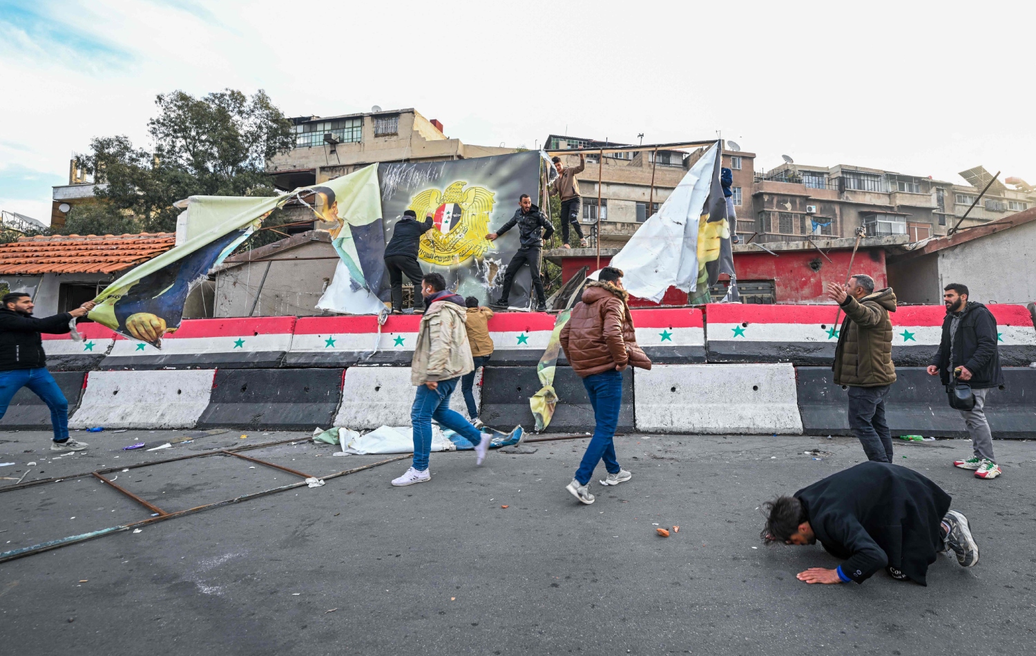 ژمارەیەک خەڵک ئەمڕۆ (یەکشەممە، 8-12-2024) لە شەقامێکی دیمەشق وێنەی بەشار ئەسەد و درووشمەکانی حکومەتەکەی دەدڕێنن. وێنە: LOUAI BESHARA / AFP