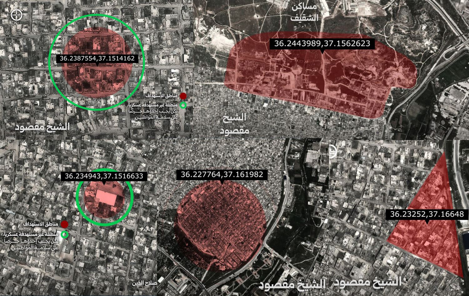 سوپای سووریا نەخشە و وێنەی ئاسمانیی ئەو شوێنانەی بڵاوکردەوە کە لە نێو گەڕەکی شێخ مەقسوود هێرشیان دەکاتە سەر و داوا لە دانیشتووان دەکات بەپەلە لێیان دووربکەونەوە.