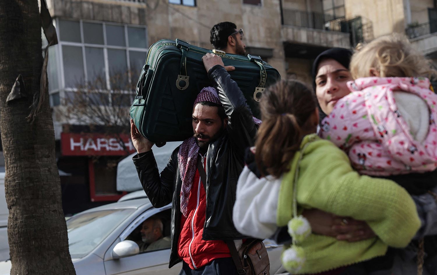 ئاوارەبوونی خێزانێک لە حەلەب بەهۆی هێرشی سوپای عەرەبیی سووریا بۆ سەر گەڕەکە کوردییەکانی شارەکە. وێنە: Bakr ALkasem / AFP