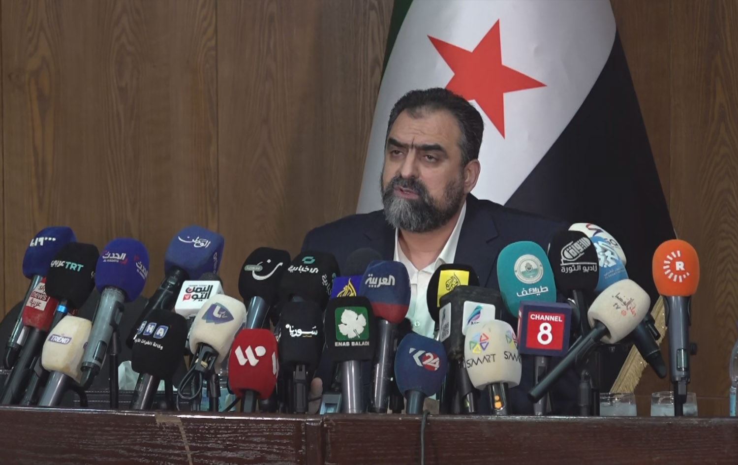 حەسەن سۆفان، ئەندامی لیژنەی باڵای ئاشتەوایی نیشتمانیی سووریا لە کۆنفرانسێکی رۆژنامەڤانیدا لە دیمەشق قسە دەکات