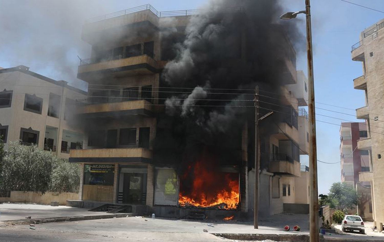 دیمەنی سووتانی بینایەک لەکاتی گرژییەکانی مانگی رابردووی سوەیدای سووریا. وێنە: UNOCHA/Ali Haj Suleiman