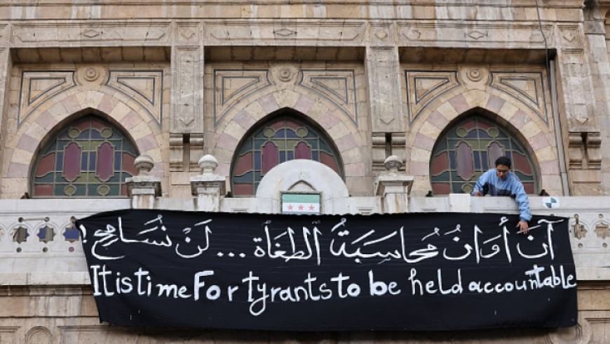 بە زمانی عەرەبی لەسەر لافیتەیەک لە سووریا نووسراوە: کاتی دادگاییکردنی زۆردارانە... لێیان خۆشنابین. وێنە: AFP