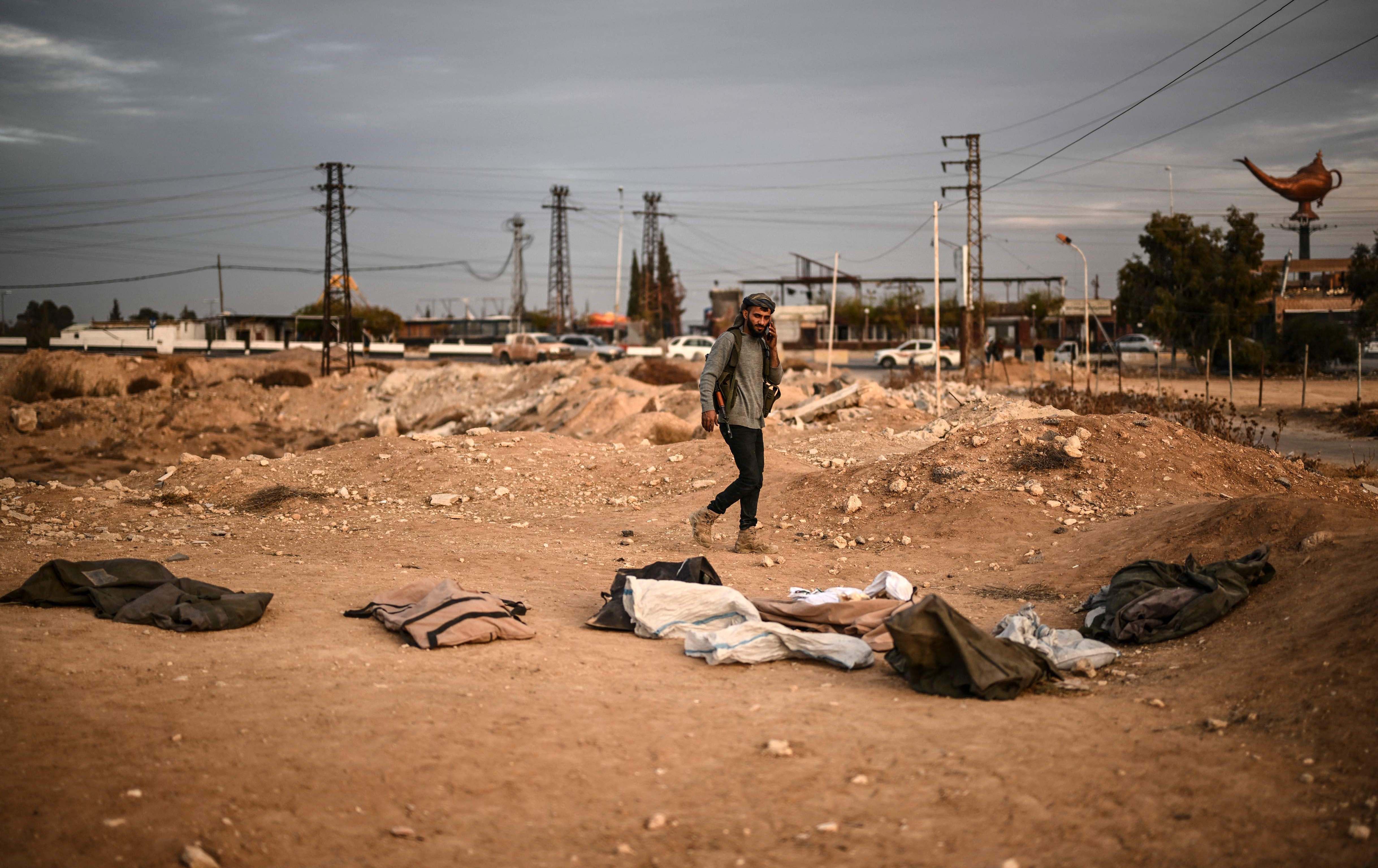 پیاوێک لە لای چەند فەردەیەکی پڕ لە ئێسقان لە دیمەشق، کە لە پاش رووخاندنی بەشار ئەسەد دۆزراونەتەوە. وێنە: AFP