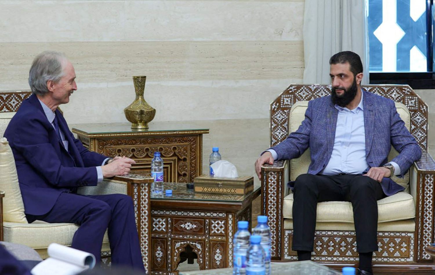 ئەحمەد شەرع، سەرۆکی دەستەی تەحریری شام کە سەرکردایەتیی دەسەڵاتی نوێی سووریا دەکات، شەوی رابردوو لە دیمەشق لەگەڵ گیێر پیدەرسن، نێردەی تایبەتی نەتەوە یەکگرتووەکان بۆ کاروباری سووریا کۆبووەوە.