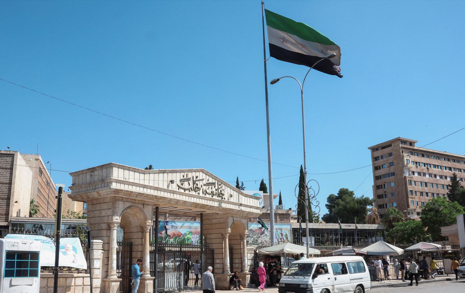 ژمارەیەک هاووڵاتیی سووریا لەنزیک ئاڵای وڵاتەکەیان بەسەر باڵەخانەیەکی حکومییەوە لە حەلەب. وێنە: REUTERS/Mahmoud Hassano
