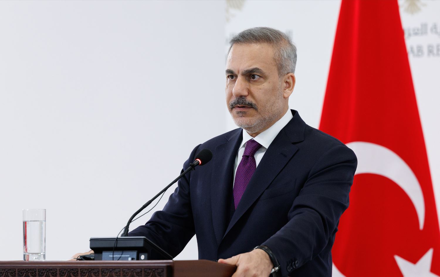 هاکان فیدان، وەزیری دەرەوەی تورکیا لە کۆنفرانسێکی رۆژنامەڤانیی هاوبەش لەگەڵ ئەسعەد شەیبانی، هاوتا سووریاییەکەی. وێنە: AA