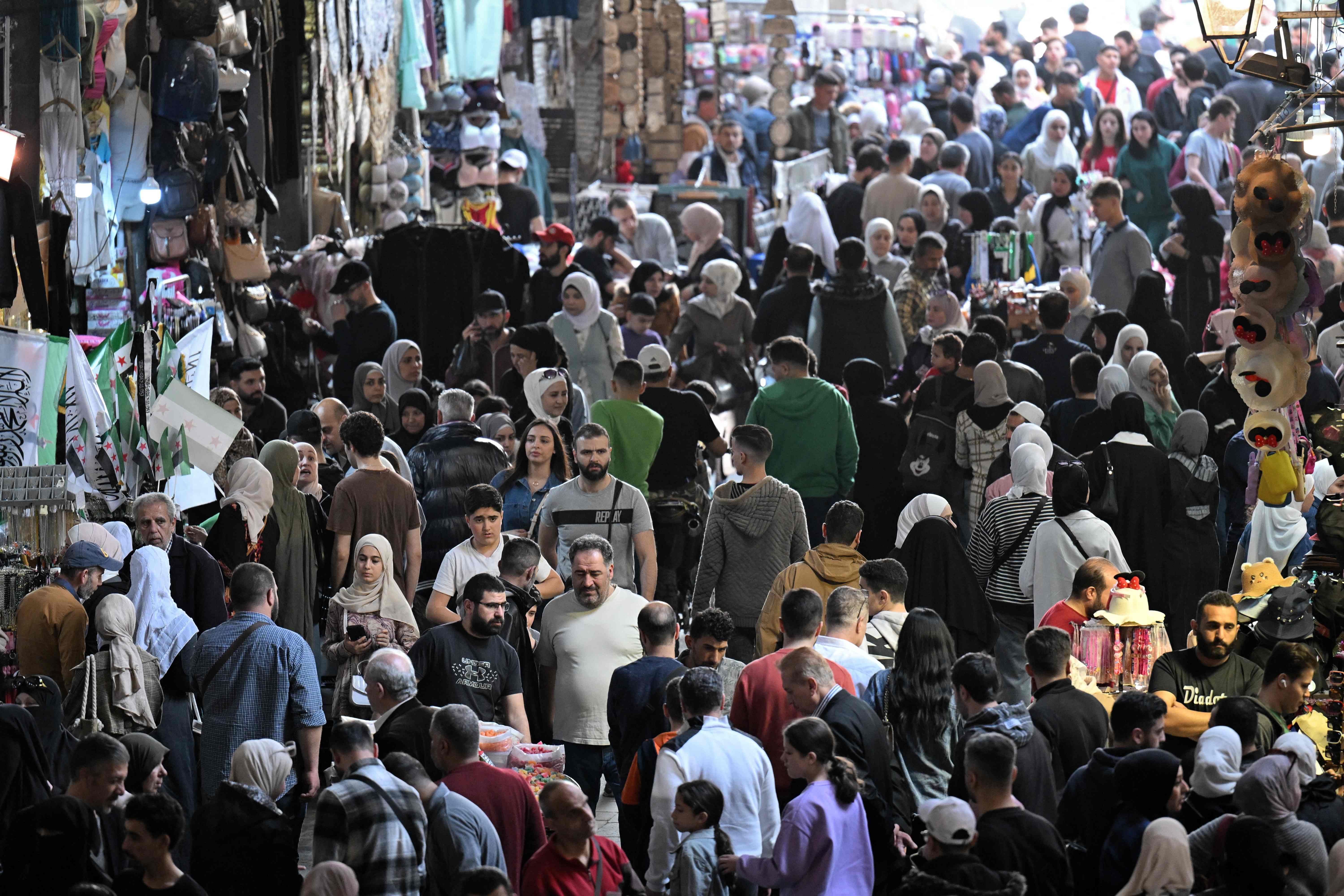 شەوی 29-3-2025، خەڵک لە بازاڕێکی دیمەشق خەریکی بازاڕیکردنن بۆ جەژن. وێنە: LOUAI BESHARA / AFP