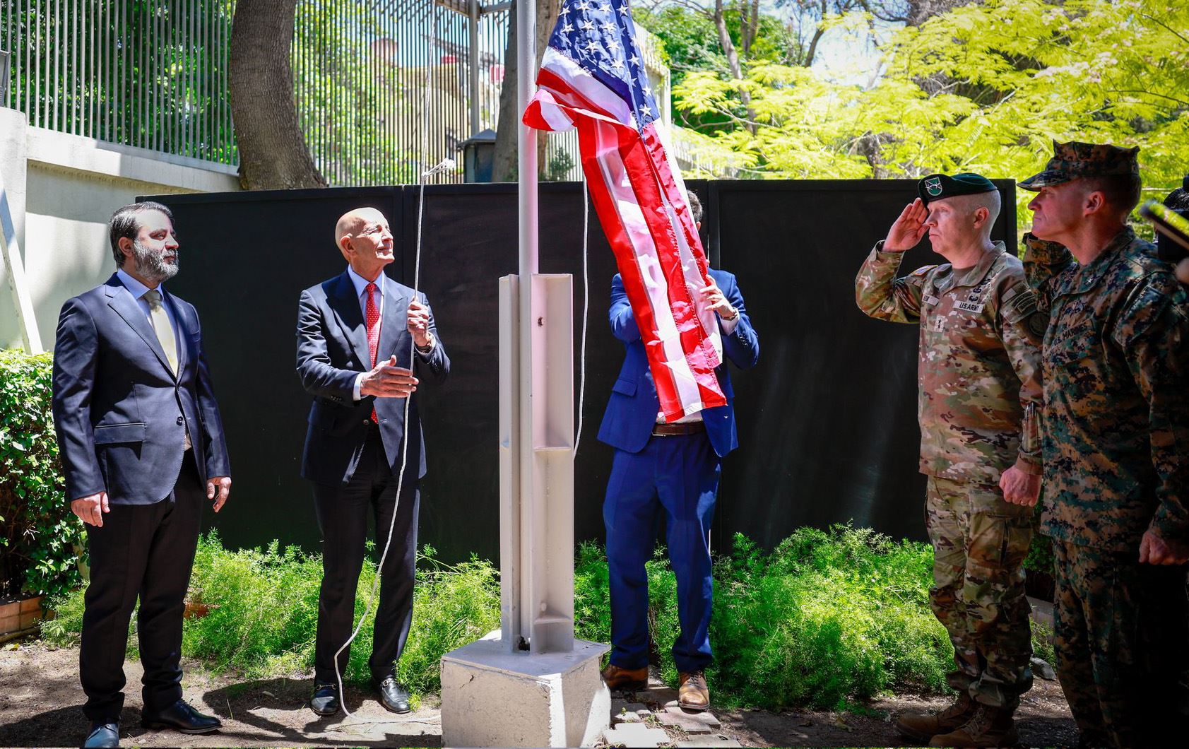 تۆماس باراک، باڵیۆزی ئەمریکا لە تورکیا و نوێنەری ئەو وڵاتە بۆ سووریا [ئەوەی پەتی ئاڵاکەی بەدەستەوە گرتووە]، لە دیمەشق ئاڵای ئەمریکای هەڵکرد. هەروەها ئەسعەد شەیبانی، وەزیری دەرەوەی سووریا [یەکەم کەسی لای چەپ] ئامادەیە.
