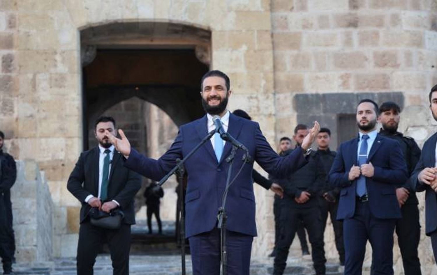 کەمێک دواتر، شەرع لەسەر تاوەری قەڵاکە و لەنزیک ئاڵایەکی گەورەی سووریا دەرکەوت.