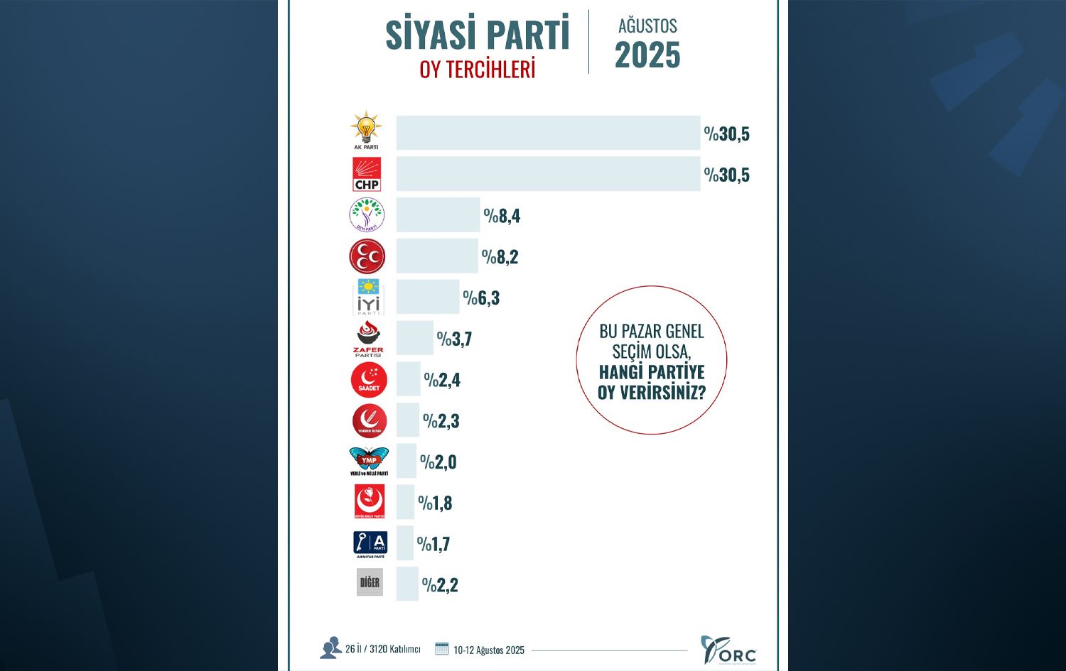 ناوەندی لێکۆڵینەوەی ORC ئەنجامی راپرسییەکی بڵاوکردەوە کە رۆژانی 10-12ـی ئابی 2025 کراوە و تێیدا ئاکپارتی و پارتی گەلی کۆماری (جەهەپە) ریژەی دەنگەکانیان یەکسانە.