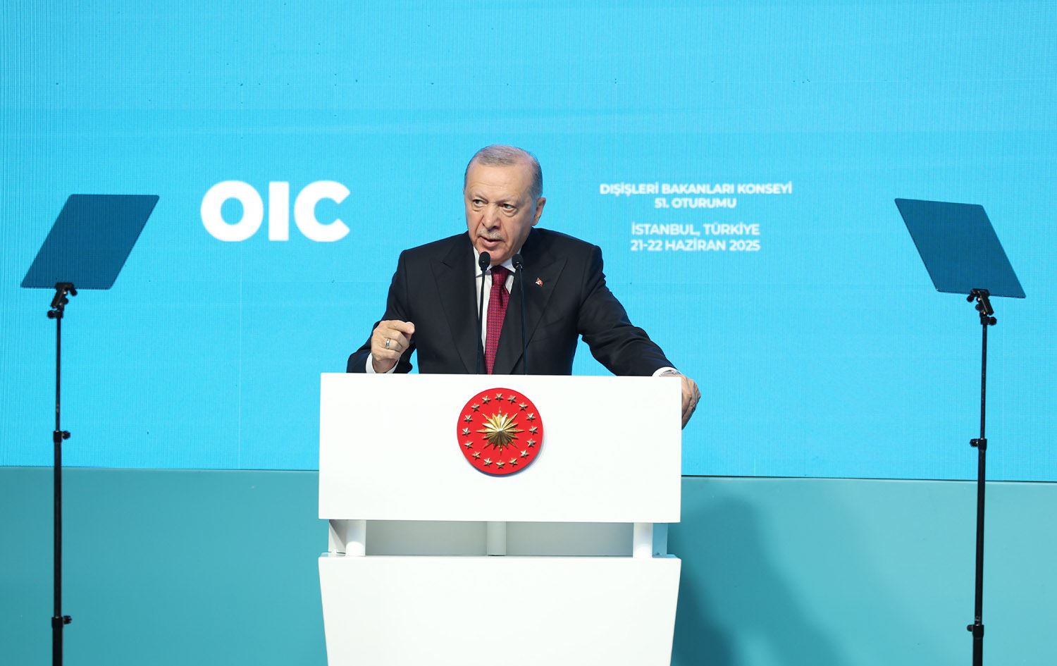 رەجەب تەیب ئەردۆغان، سەرۆککۆماری تورکیا ئەمڕۆ شەممە 21ی حوزەیرانی 2025 لە 51ـەمین کۆبوونەوەی وەزیرانی دەرەوەی رێکخراوی هاریکاریی ئیسلامی لە ئیستەنبووڵ گوتارێکی پێشکێش کرد.