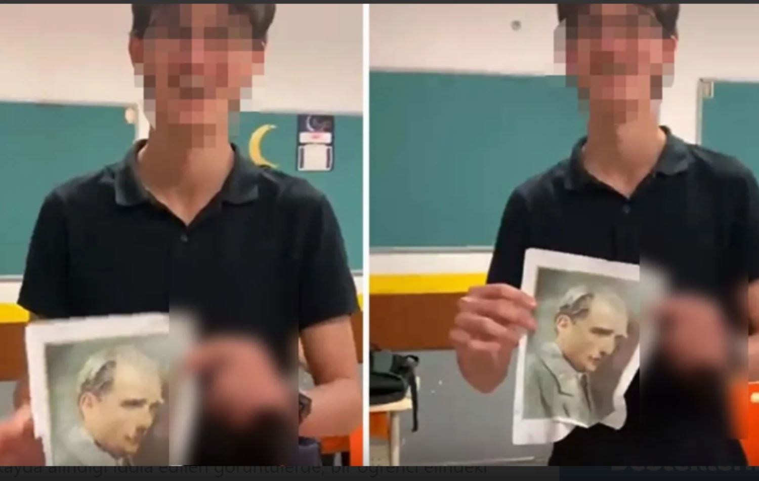 لە تۆمارە ڤیدیۆییەکەدا ئەو خوێندکارە وێنەیەکی مستەفا کەمال ئەتاتورکی لە پەرتووکەکەی کردووەتەوە و سووکایەتی پێدەکات و هاوڕێکانی بە مۆبایل تۆماری دەکەن.