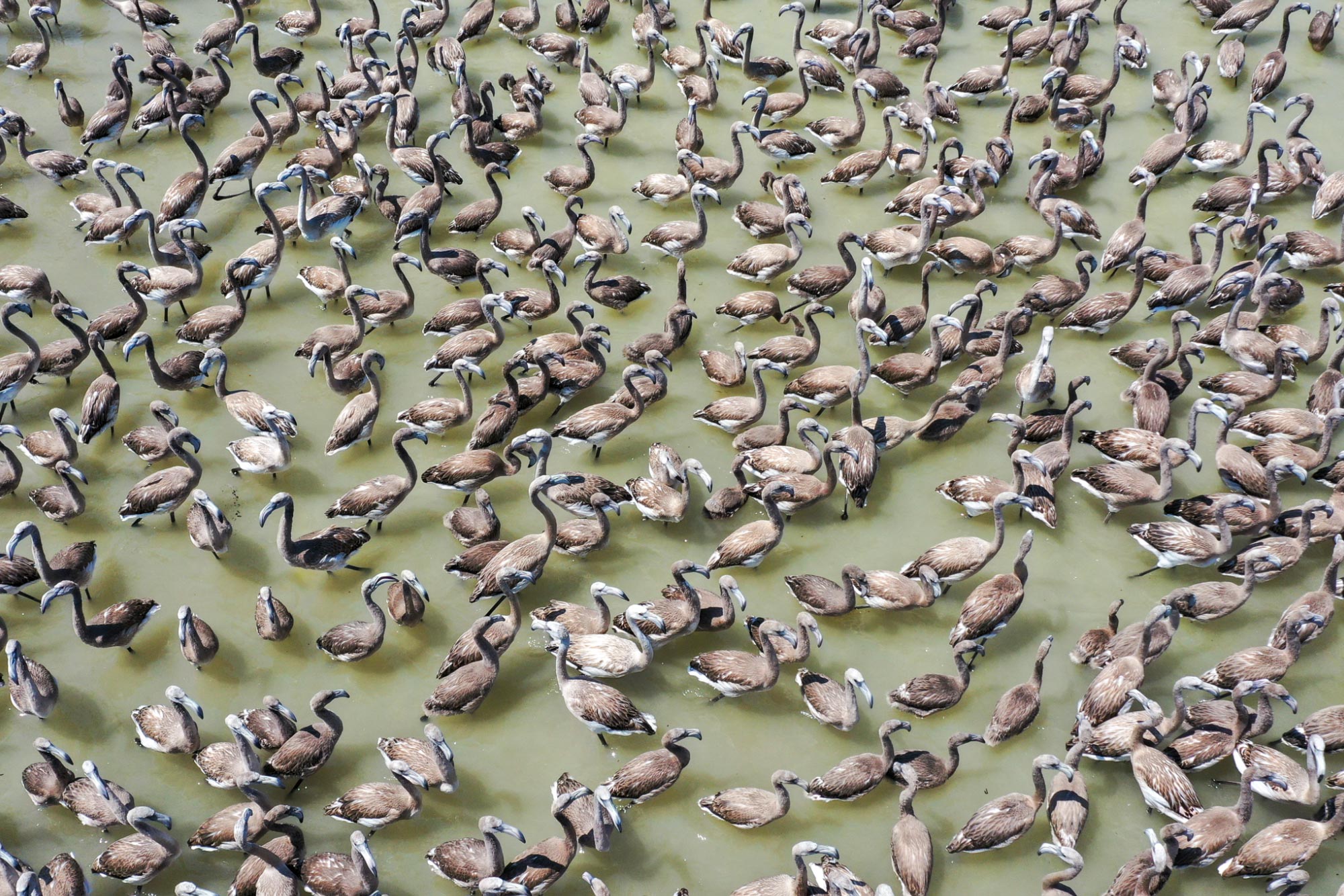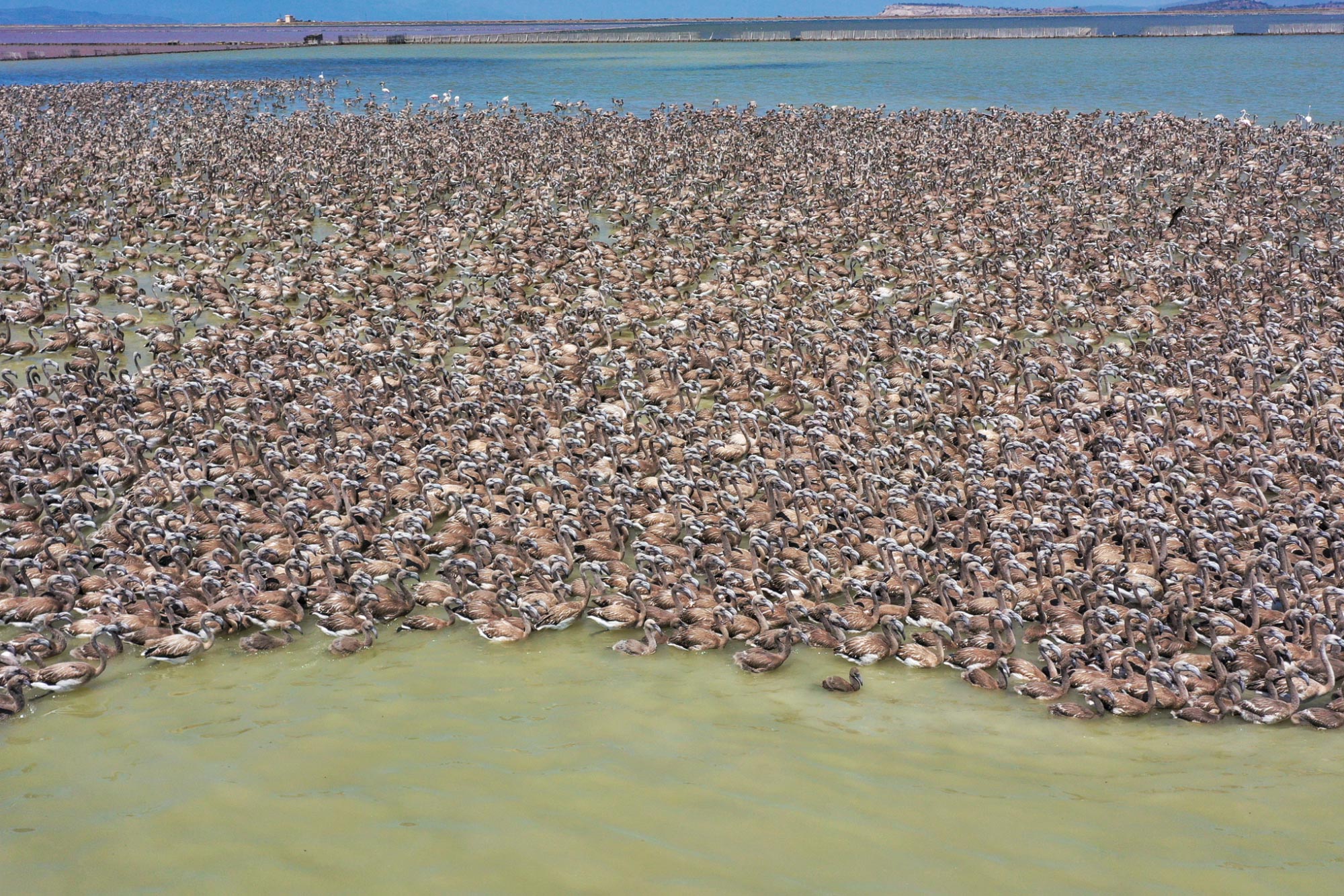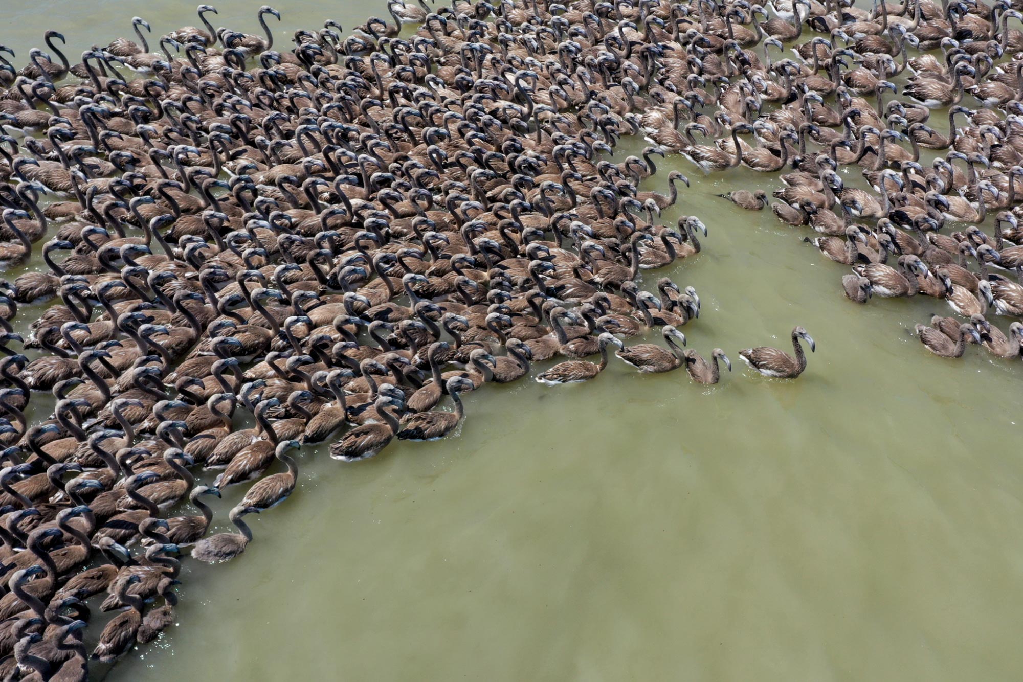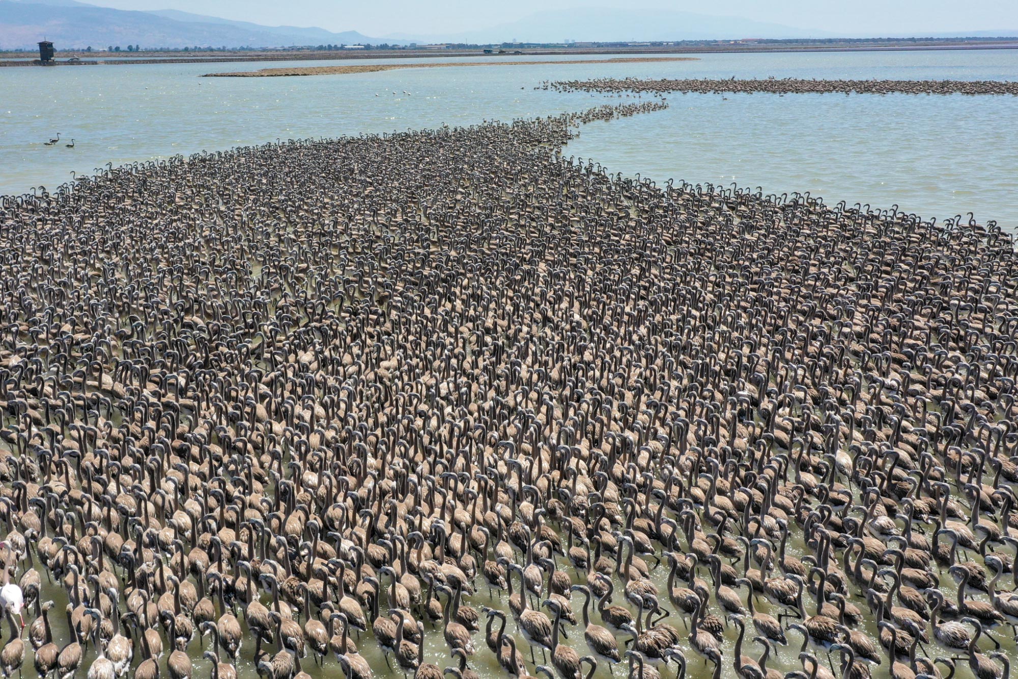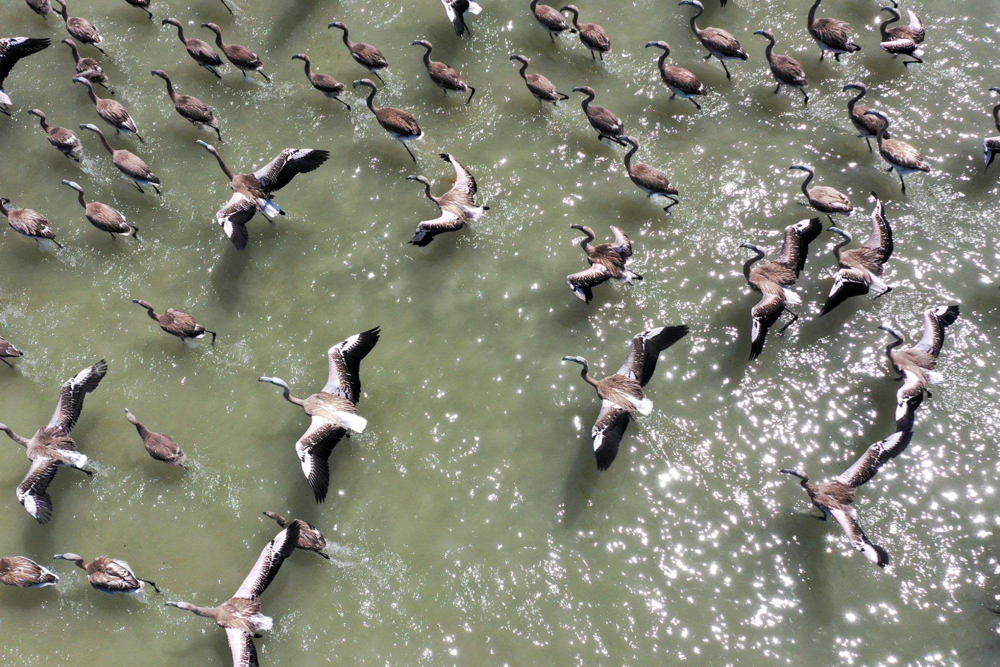 لە کێڵگەیەکی بەخێوکردنی فلامینگۆ لە ئیزمیری تورکیا، 18 هەزار فلامینگۆ دوای ئەوەی لە هێلکەکانیان دەرهاتوون خۆیان ئامادەدەکەن بۆ فڕین و دەستیان بە فڕین کردووە.