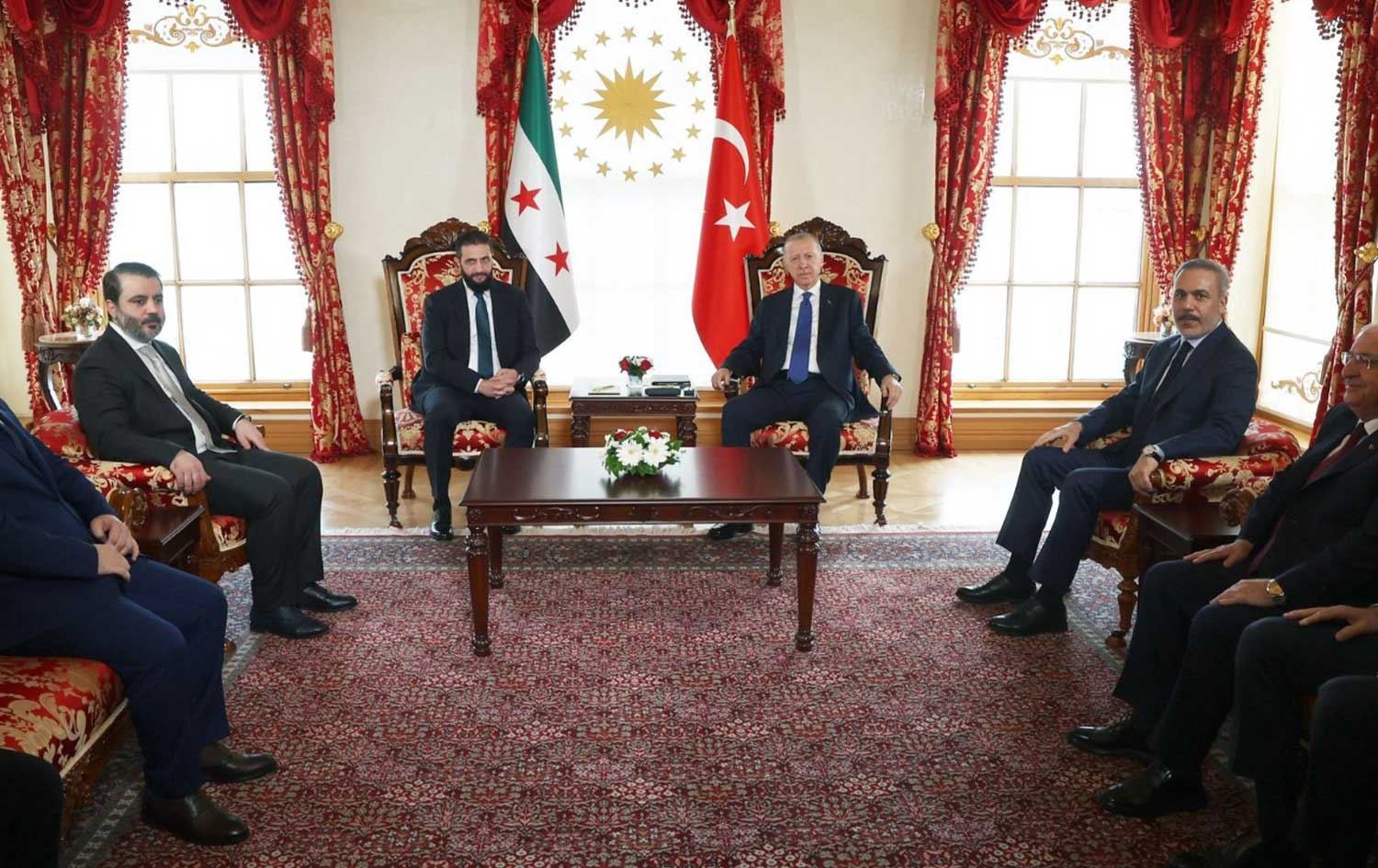 رەجە تەیب ئەردۆغان، سەرۆککۆماری تورکیا رۆژی شەممە، 24ـی ئایاری 2025، لە کۆشکی دۆڵمەباخچە لە ئیستەنبووڵ پێشوازی لە ئەحمەد شەرع، سەرۆکی کاتیی سووریا کرد و دواتریش کۆبوونەوە.
