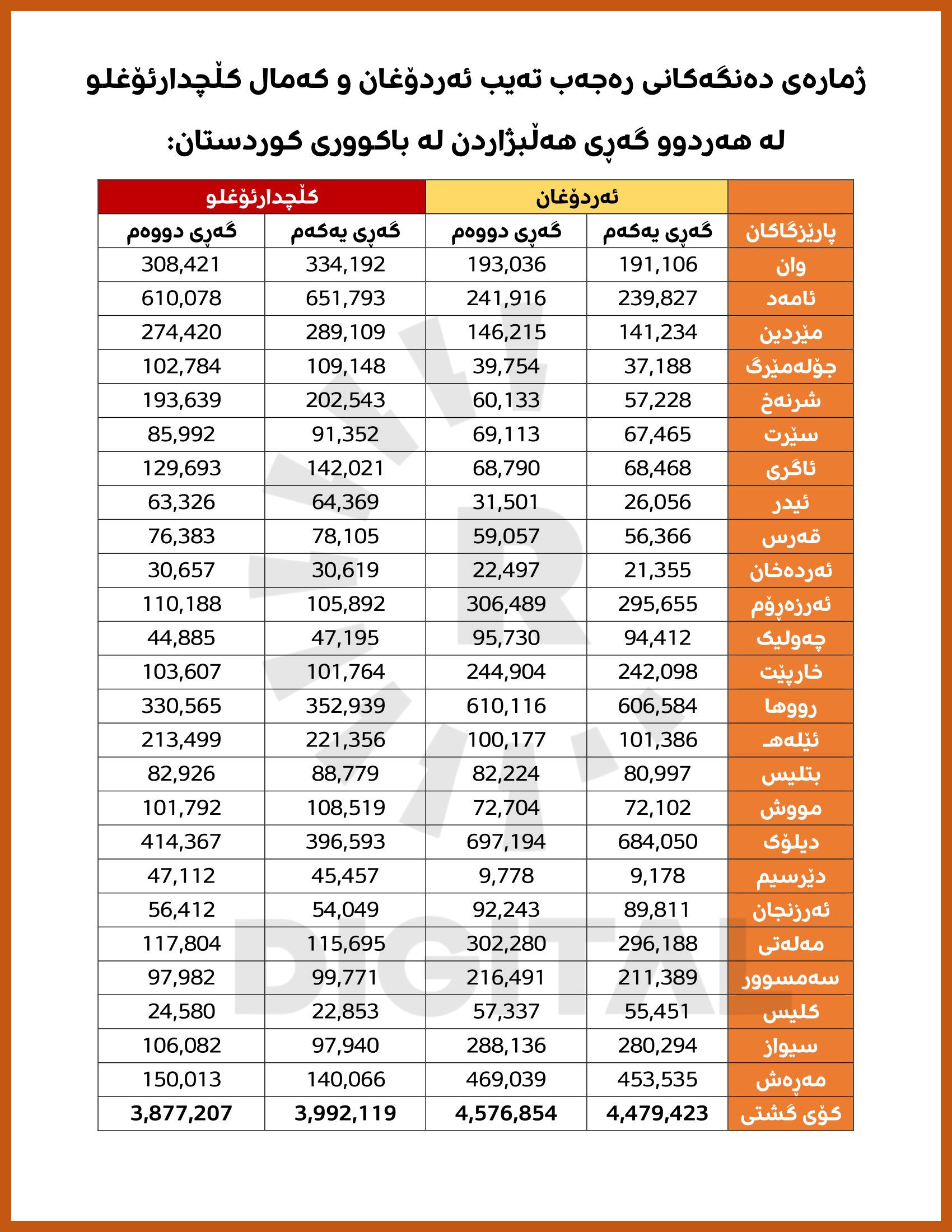 لە گەڕی یەکەمدا بە هەر چوار بەربژێرەکە لە 25 پارێزگاکەی باکووری کوردستان 8 ملیۆن و 796 هەزار و 197 کەس دەنگیان بەدەستهێنابوو.