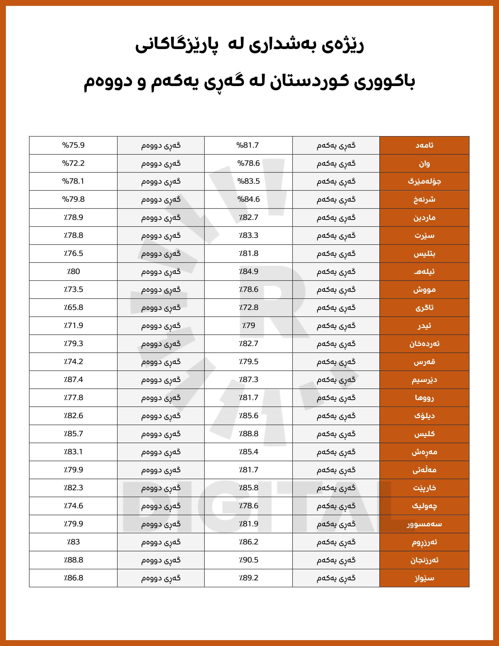 هەروەک ناوەندەکانی راپرسی پێشبینیان دەکرد، رێژەی بەشداری دەنگدان لە پارێزگاکانی باکووری کوردستان لە گەڕی دووەمی هەڵبژاردندا بە بەراورد بە گەڕی یەکەم، کەمی کردووە.