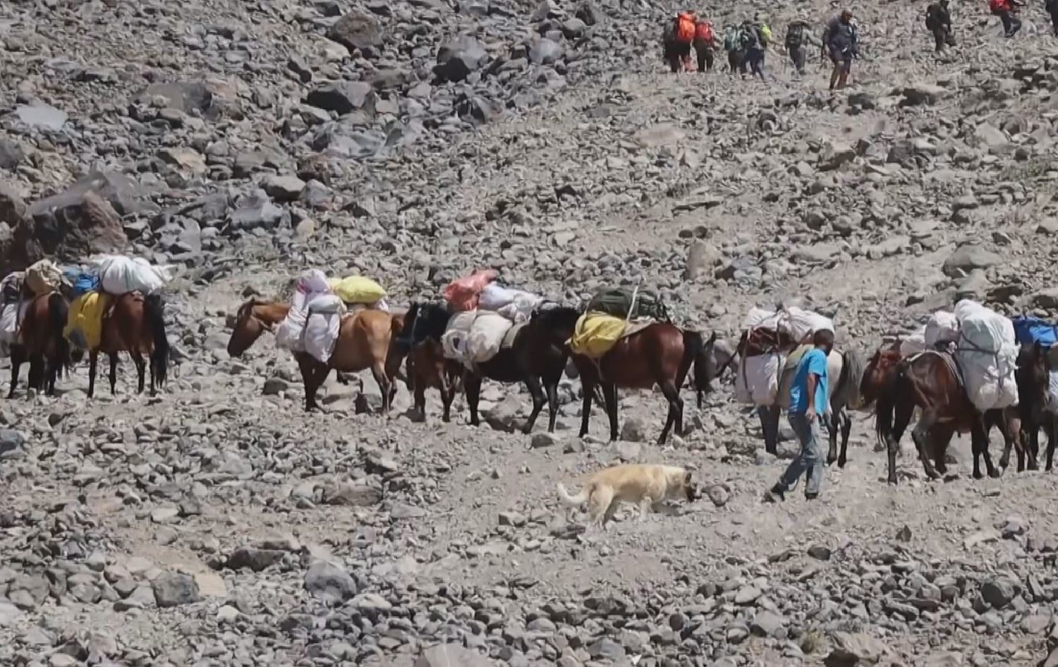 لە بناری چیای ئاگریی باکووری کوردستان، کەلوپەلی گەشتیاران باردەکرێت، خاوەن ئەسپەکان گوندنشینانی پارێزگاکانی ئاگری و ئیدری باکووری کوردستانن، کە خۆیشیان سواری ئەسپەکان دەبن و بەرەو لووتکەی چیاکە بەڕێدەکەون.