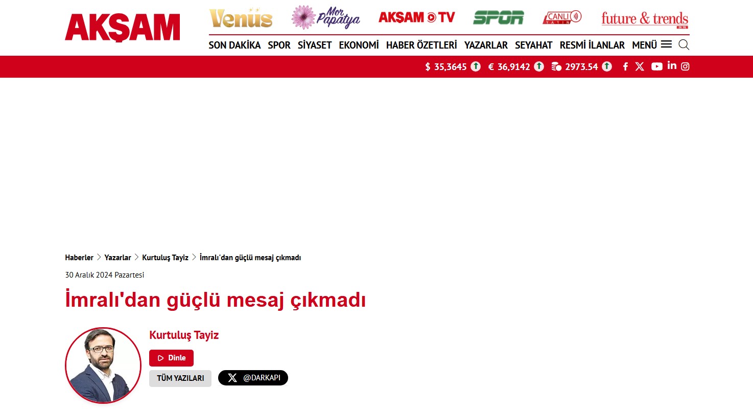 رۆژنامەڤان، کورتوڵوش تایز، لە گۆشەیەکیدا بۆ رۆژنامەی ئاکشام (Akşam Gazetesi) ئاماژەی بەوە دا، حکومەتی تورکیا بە جۆرێک دەبینرێت ''ئامادەیە هەنگاو بۆ ئەمە بنێت کە سزای زیندانیکردن لە ماڵ بۆ عەبدوڵڵا ئۆجەلان دەربکات، تەنیا لەپێناو ئەوەی سەردەمێکی تیرۆر کە 40 ساڵە بەردەوامە، بەکۆتابێت.''