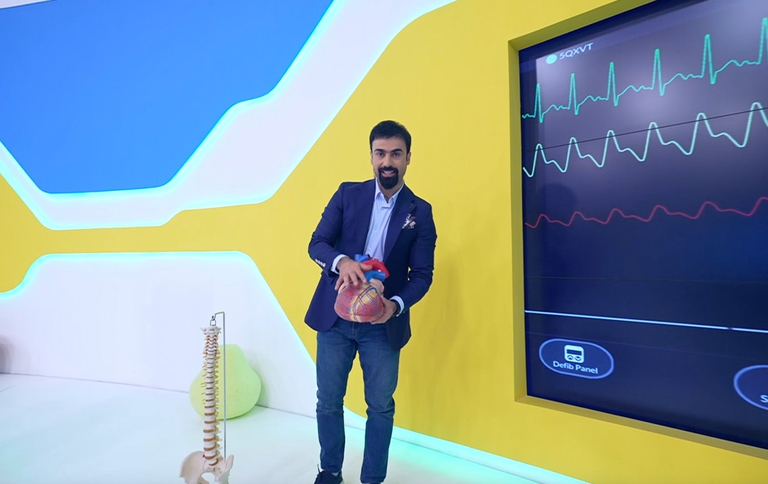 گەنجێک لەنێو ستۆدیۆ لەسەر تەختی نەخۆشخانە پاڵکەوتووە، لە تەنیشتیدا ئامێری هێڵکاری دڵ هەیە و لە شەش سەرەوە لە جەستەی بەستراوەتەوە، ئامانج لە دانانی ئامێرەکە پێشاندانی شێوازی ئەنجامدانی هێڵکاریی دڵە. دکتۆر سەڵاحەدین دەڕواتە لای شاشەی سەرەکیی ستۆدیۆ و باسی وردەکاریی هێڵ و ئاماژەکانی نێو هێڵکارییەکە دەکات و دەڵێت: هەر خاڵ و هێڵێک مانای خۆی هەیە.