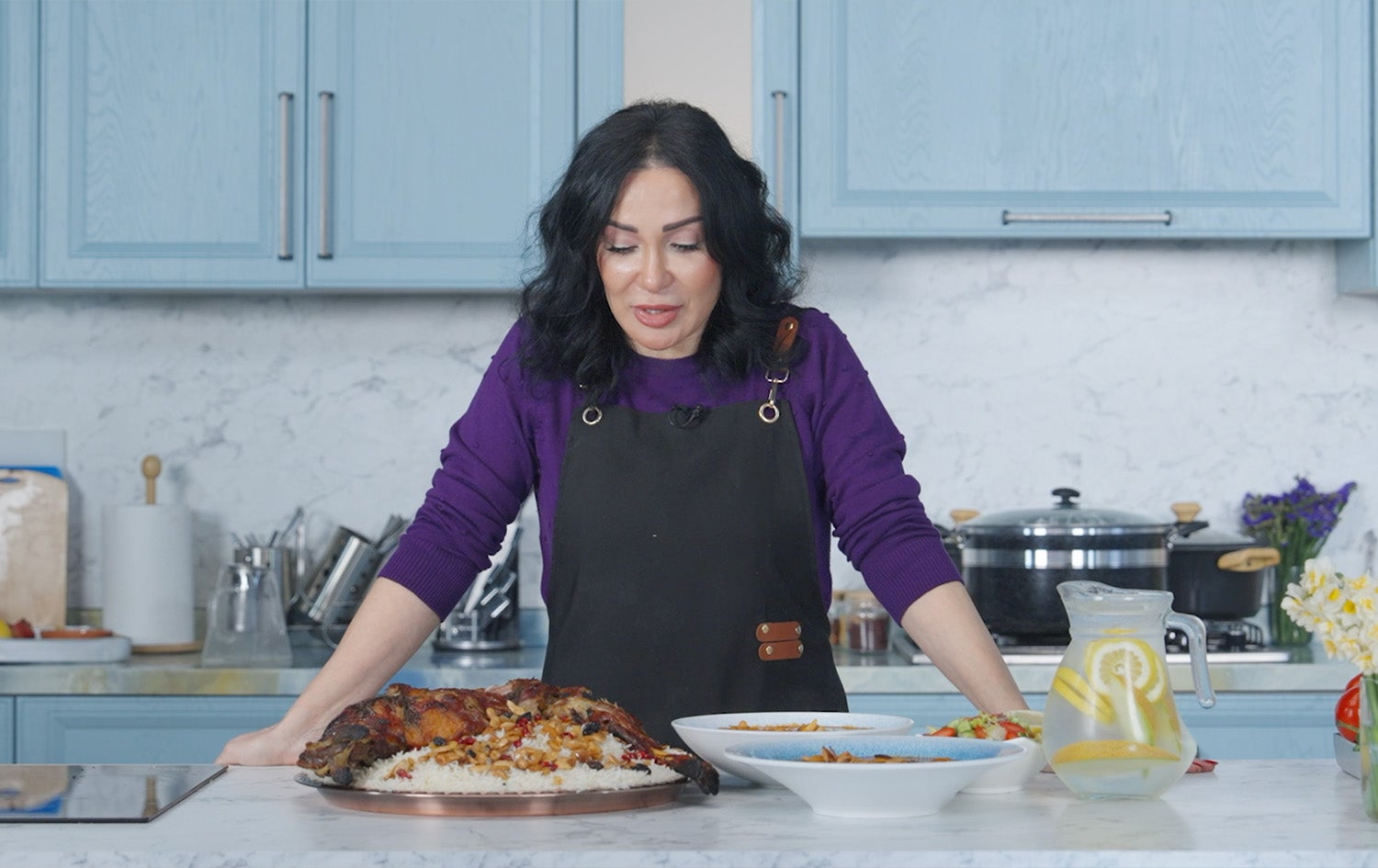 6. رازاندنەوە و پێشکێش کردن: گۆشتەکە دەبرژێت و زەڵاتەش ئامادە دەکرێت. دوو دەنک هەناریش بۆ رازاندنەوە دەخرێتە سەر برنجەکە بۆ ئەوەی رەنگێکی جوانی بداتێ.