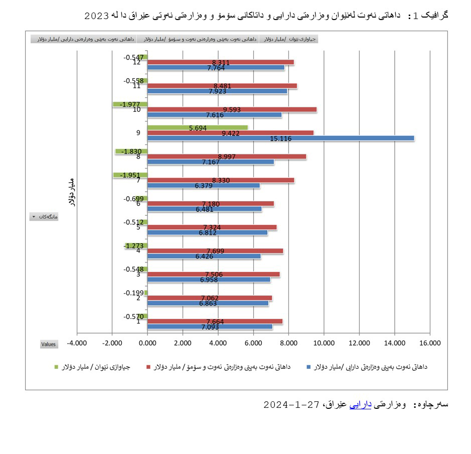 تێبینی 2: * خەمڵاندن بۆ داهاتی نەوت و سامانە سرووشتییەکان بۆ مانگی 12 لە داتاکانی وەزارەتی دارایی عێراق کراوە، چونکە وەزارەتی دارایی عێراق هێشتا راپۆرتی داهات و خەرجییەکانی مانگی کانوونی یەکەمی 2023 بڵاونەکردووەتەوە.