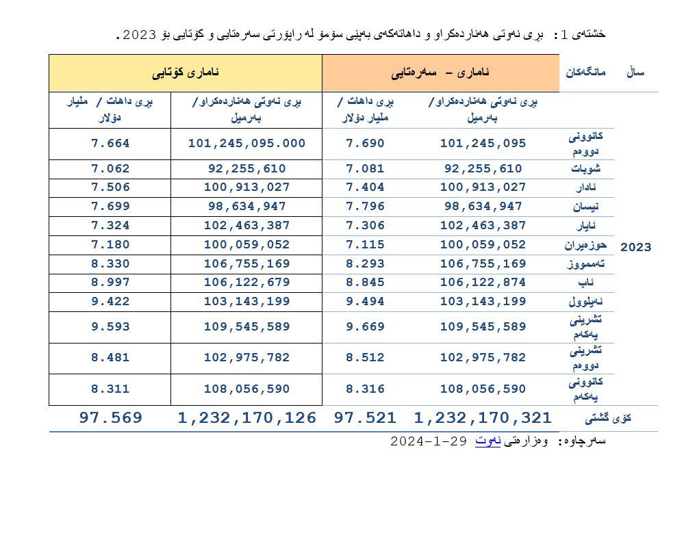 تێبینی 1: نرخی یەک دۆلار بە 1300 دینار دانراوە لە تەواوی مانگەکانی 2023ـدا، بەڵام مانگی یەک نرخی 1 دۆلار بە 1450 دینار وەک بانکی ناوەندی دانراوە.